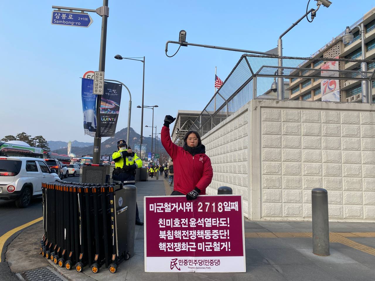 28일 민중민주당(민중당)은 미대사관앞에서 <친미호전윤석열타도! 북침핵전쟁책동중단! 핵전쟁화근 미군철거!> 구호를 들고 평화시위를 2718일째 전개했다.