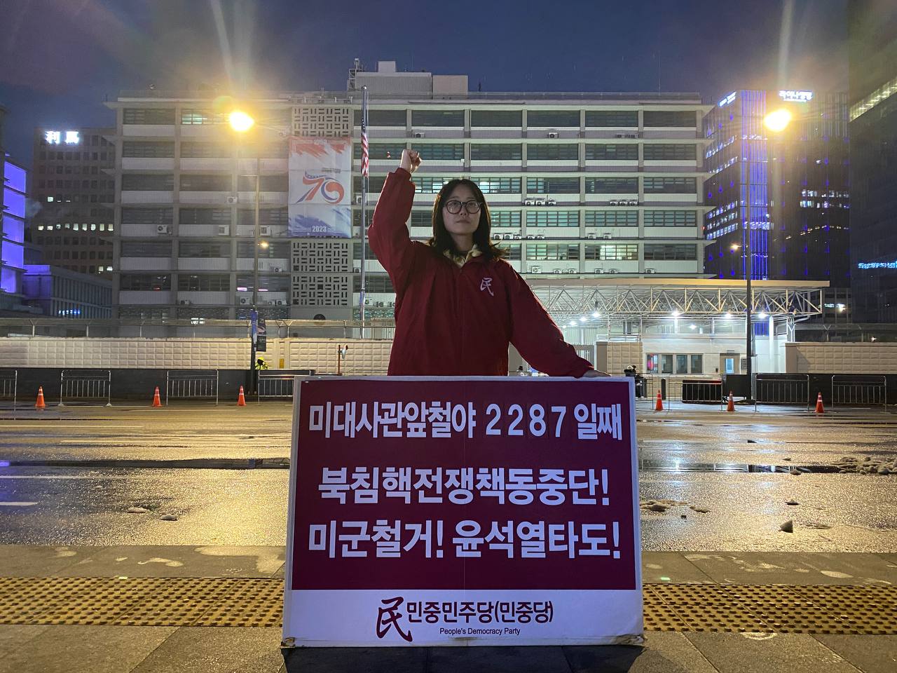 31일 민중민주당(민중당)은 미대사관앞에서 <친미호전윤석열타도! 북침핵전쟁책동중단! 핵전쟁화근 미군철거!> 구호를 들고 평화시위를 2721일째 전개했다.
