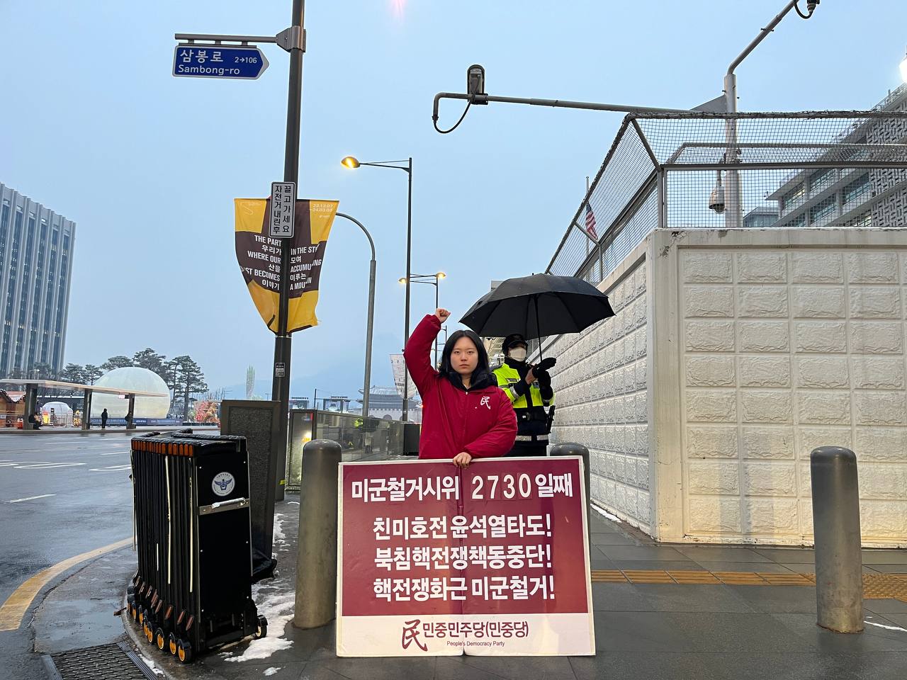 9일 민중민주당(민중당)은 미대사관앞에서 <친미호전윤석열타도! 북침핵전쟁책동중단! 핵전쟁화근 미군철거!> 구호를 들고 평화시위를 2730일째 전개했다.