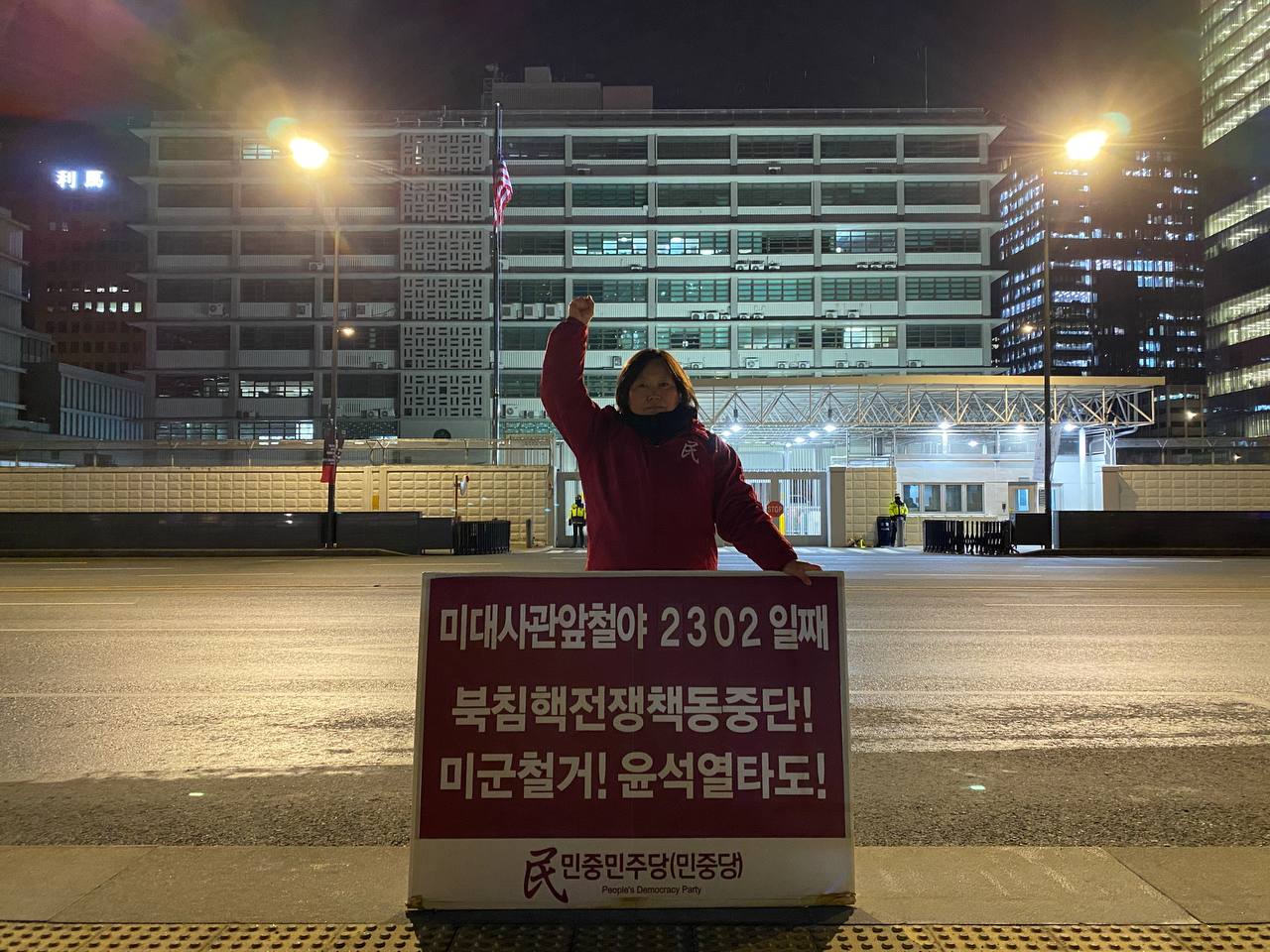 15일 민중민주당(민중당)은 미대사관앞에서 <친미호전윤석열타도! 북침핵전쟁책동중단! 핵전쟁화근 미군철거!> 구호를 들고 평화시위를 2736일째 전개했다.