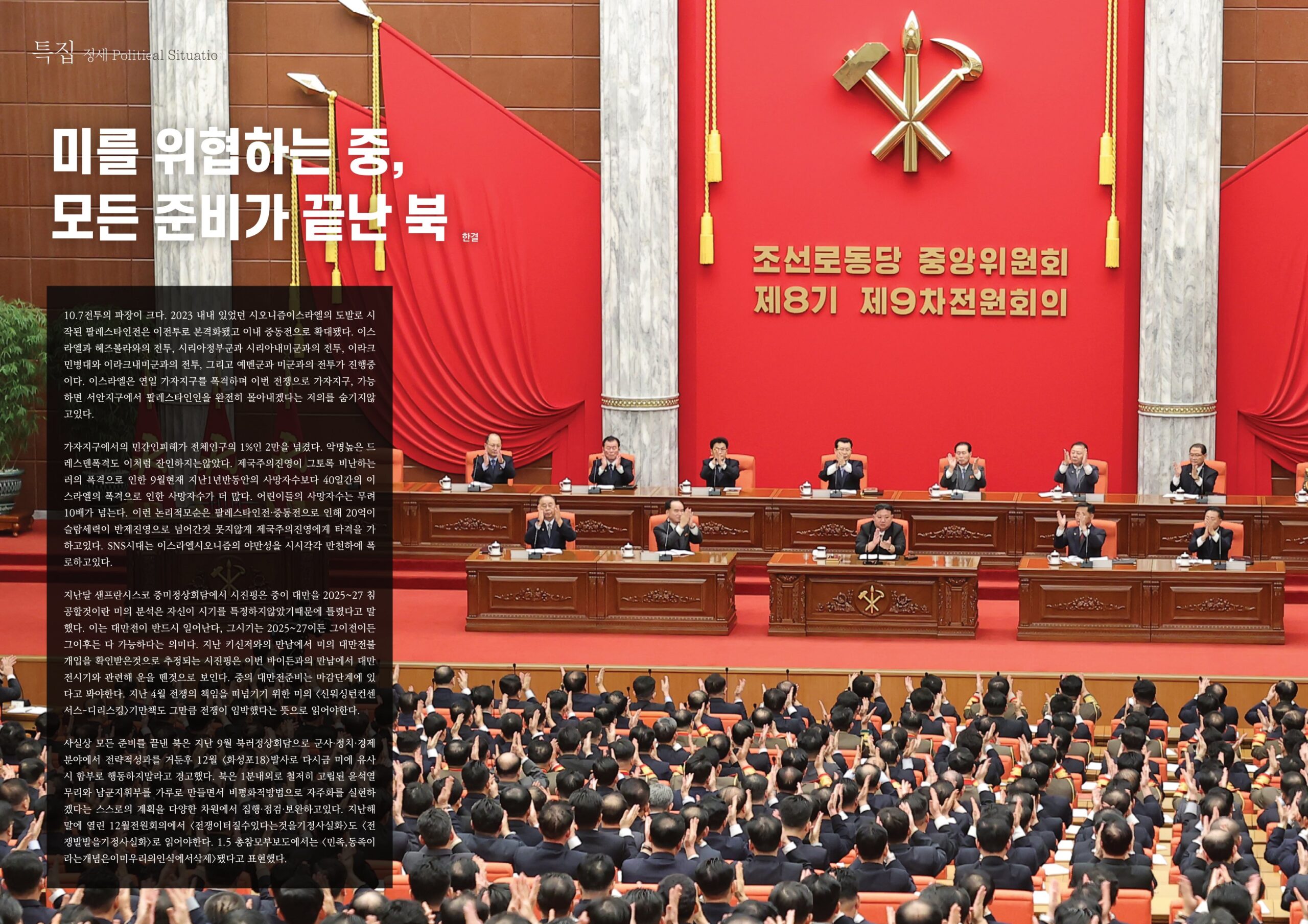 사실상 모든 준비를 끝낸 북은 지난 9월 북러정상회담으로 군사·정치·경제분야에서 전략적성과를 거둔후 12월 <화성포18>발사로 다시금 미에 유사시 함부로 행동하지말라고 경고했다. 북은 1분내외로 철저히 고립된 윤석열무리와 남군지휘부를 가루로 만들면서 비평화적방법으로 자주화를 실현하겠다는 스스로의 계획을 다양한 차원에서 집행·점검·보완하고있다. 지난해말에 열린 12월전원회의에서 <전쟁이터질수있다는것을기정사실화>도 <전쟁발발을기정사실화>로 읽어야한다. 1.5 총참모부보도에서는 <민족,동족이라는개념은이미우리의인식에서삭제>됐다고 표현했다.
