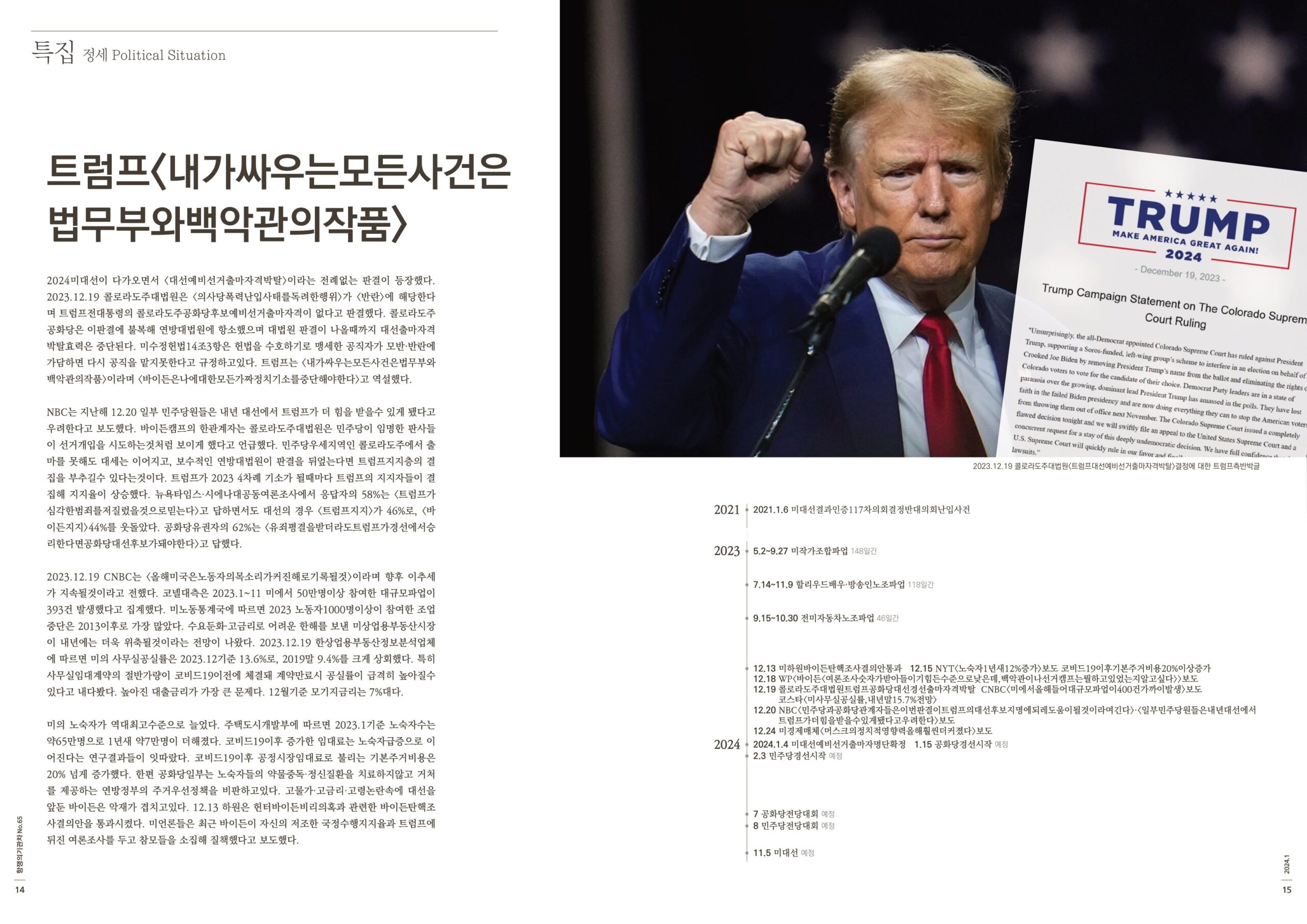 2024미대선이 다가오면서 <대선예비선거출마자격박탈>이라는 전례없는 판결이 등장했다. 2023.12.19 콜로라도주대법원은 <의사당폭력난입사태를독려한행위>가 <반란>에 해당한다며 트럼프전대통령의 콜로라도주공화당후보예비선거출마자격이 없다고 판결했다. 콜로라도주공화당은 이판결에 불복해 연방대법원에 항소했으며 대법원 판결이 나올때까지 대선출마자격박탈효력은 중단된다. 미수정헌법14조3항은 헌법을 수호하기로 맹세한 공직자가 모반·반란에 가담하면 다시 공직을 맡지못한다고 규정하고있다. 트럼프는 <내가싸우는모든사건은법무부와백악관의작품>이라며 <바이든은나에대한모든가짜정치기소를중단해야한다>고 역설했다.
