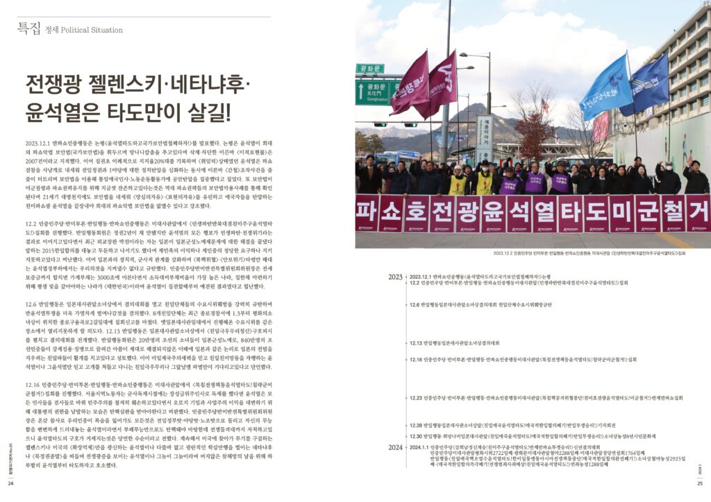 12.6 반일행동은 일본대사관앞소녀상에서 결의대회를 열고 친일단체들의 수요시위훼방을 강력히 규탄하며 반윤석열투쟁을 더욱 가열차게 벌여나갈것을 결의했다. 8개친일단체는 최근 종로경찰서에 1.3부터 평화의소녀상이 위치한 종로구율곡로2길일대에 집회신고를 마쳤다. 옛일본대사관일대에서 진행해온 수요시위를 같은 장소에서 열리지못하게 할 의도다. 12.13 반일행동은 일본대사관앞소녀상에서 <친일극우무리청산>구호피시를 펼치고 결의대회를 전개했다. 반일행동회원은 20만명의 조선의 소녀들이 일본군성노예로, 840만명의 조선민중들이 강제징용·징병으로 끌려간 아픔이 제대로 해결되지않은 이때에 일본과 같은 논리로 일본의 전범을 지우려는 친일파들이 활개를 치고있다고 성토했다. 이어 미일제국주의세력을 믿고 친일친미망동을 자행하는 윤석열이나 그윤석열만 믿고 고개를 쳐들고 다니는 친일극우무리나 그앞날엔 파멸만이 기다리고있다고 단언했다.