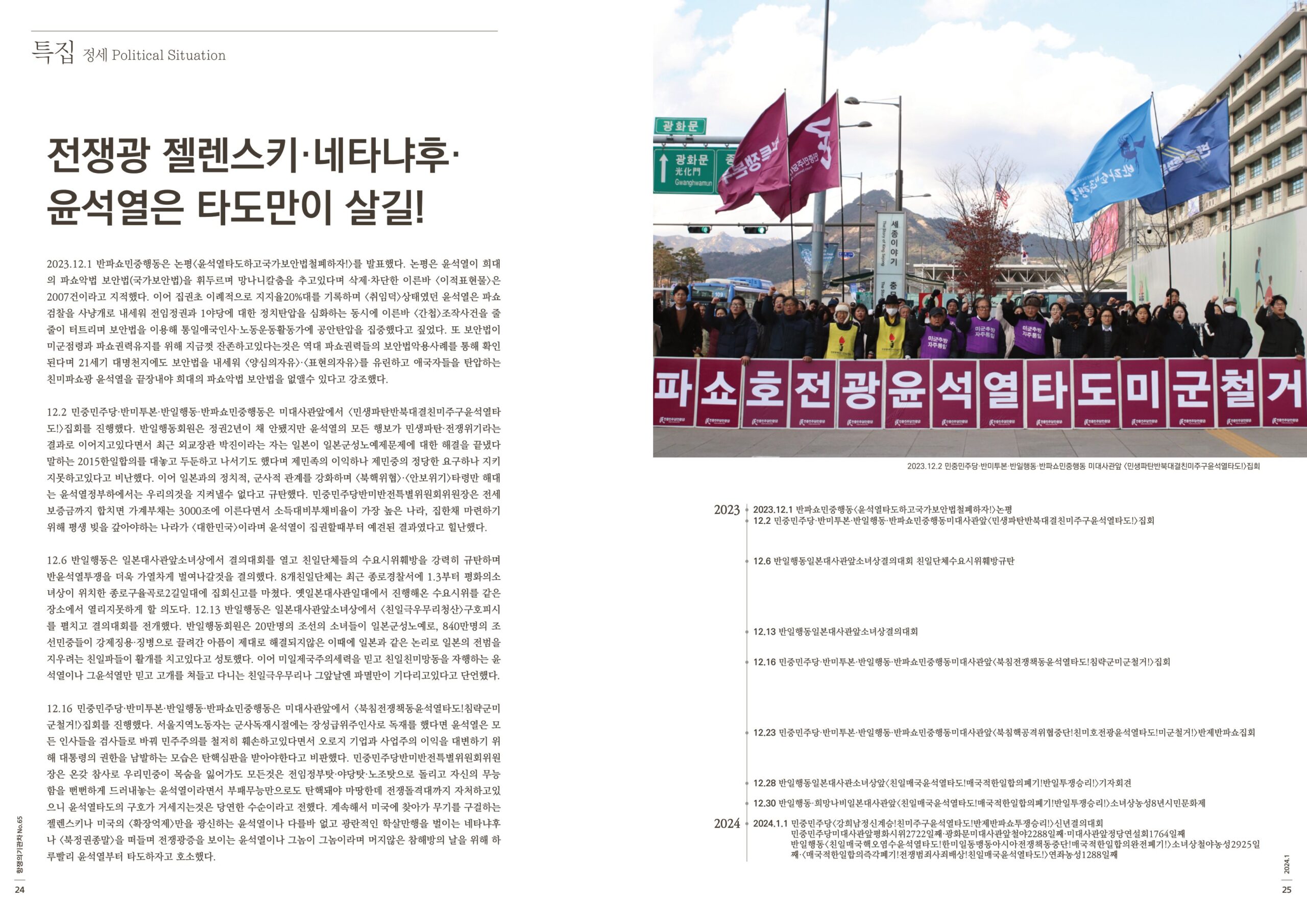 12.16 민중민주당·반미투본·반일행동·반파쇼민중행동은 미대사관앞에서 <북침전쟁책동윤석열타도!침략군미군철거!>집회를 진행했다. 서울지역노동자는 군사독재시절에는 장성급위주인사로 독재를 했다면 윤석열은 모든 인사들을 검사들로 바꿔 민주주의를 철저히 훼손하고있다면서 오로지 기업과 사업주의 이익을 대변하기 위해 대통령의 권한을 남발하는 모습은 탄핵심판을 받아야한다고 비판했다. 민중민주당반미반전특별위원회위원장은 온갖 참사로 우리민중이 목숨을 잃어가도 모든것은 전임정부탓·야당탓·노조탓으로 돌리고 자신의 무능함을 뻔뻔하게 드러내놓는 윤석열이라면서 부패무능만으로도 탄핵돼야 마땅한데 전쟁돌격대까지 자처하고있으니 윤석열타도의 구호가 거세지는것은 당연한 수순이라고 전했다. 계속해서 미국에 찾아가 무기를 구걸하는 젤렌스키나 미국의 <확장억제>만을 광신하는 윤석열이나 다를바 없고 광란적인 학살만행을 벌이는 네타냐후나 <북정권종말>을 떠들며 전쟁광증을 보이는 윤석열이나 그놈이 그놈이라며 머지않은 참해방의 날을 위해 하루빨리 윤석열부터 타도하자고 호소했다.