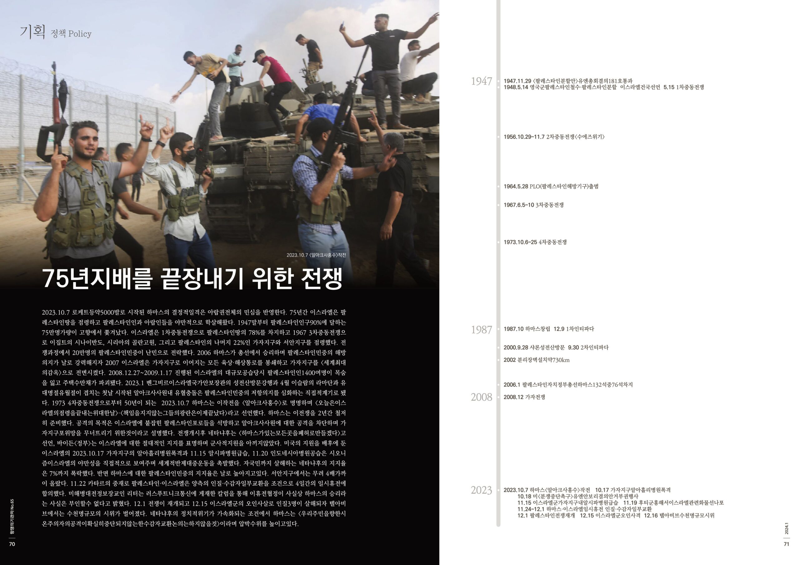 2023.10.7 로케트등약5000발로 시작된 하마스의 결정적일격은 아랍권전체의 민심을 반영한다. 75년간 이스라엘은 팔레스타인땅을 점령하고 팔레스타인인과 아랍인들을 야만적으로 학살해왔다. 1947말부터 팔레스타인인구90%에 달하는 75만명가량이 고향에서 쫓겨났다. 이스라엘은 1차중동전쟁으로 팔레스타인땅의 78%를 차지하고 1967 3차중동전쟁으로 이집트의 시나이반도, 시리아의 골란고원, 그리고 팔레스타인의 나머지 22%인 가자지구와 서안지구를 점령했다. 전쟁과정에서 20만명의 팔레스타인민중이 난민으로 전락했다. 2006 하마스가 총선에서 승리하며 팔레스타인민중의 해방의지가 날로 강력해지자 2007 이스라엘은 가자지구로 이어지는 모든 육상·해상통로를 봉쇄하고 가자지구를 <세계최대의감옥>으로 전변시켰다. 2008.12.27~2009.1.17 진행된 이스라엘의 대규모공습당시 팔레스타인인1400여명이 목숨을 잃고 주택수만채가 파괴됐다. 2023.1 벤그비르이스라엘국가안보장관의 성전산방문강행과 4월 이슬람의 라마단과 유대명절유월절이 겹치는 첫날 시작된 알아크사사원내 유혈충돌은 팔레스타인민중의 저항의지를 심화하는 직접적계기로 됐다. 1973 4차중동전쟁으로부터 50년이 되는 2023.10.7 하마스는 이작전을 <알아크사홍수>로 명명하며 <오늘은이스라엘의점령을끝내는위대한날>·<책임을지지않는그들의광란은이제끝났다>라고 선언했다. 하마스는 이전쟁을 2년간 철저히 준비했다. 공격의 목적은 이스라엘에 붙잡힌 팔레스타인포로들을 석방하고 알아크사사원에 대한 공격을 차단하며 가자지구포위망을 무너뜨리기 위한것이라고 설명했다. 전쟁개시후 네타냐후는 <하마스가있는모든곳을폐허로만들겠다>고 선언, 바이든<정부>는 이스라엘에 대한 절대적인 지지를 표명하며 군사적지원을 아끼지않았다. 미국의 지원을 배후에 둔 이스라엘의 2023.10.17 가자지구의 알아흘리병원폭격과 11.15 알시파병원급습, 11.20 인도네시아병원공습은 시오니즘이스라엘의 야만성을 직접적으로 보여주며 세계적반제대중운동을 촉발했다. 자국민까지 살해하는 네타냐후의 지지율은 7%까지 폭락했다. 반면 하마스에 대한 팔레스타인민중의 지지율은 날로 높아지고있다. 서안지구에서는 무려 4배가까이 올랐다. 11.22 카타르의 중재로 팔레스타인·이스라엘은 양측의 인질·수감자일부교환을 조건으로 4일간의 일시휴전에 합의했다. 미해병대전정보장교인 리터는 러스푸트니크통신에 게재한 칼럼을 통해 이휴전협정이 사실상 하마스의 승리라는 사실은 부인할수 없다고 밝혔다. 12.1 전쟁이 재개되고 12.15 이스라엘군의 오인사살로 인질3명이 살해되자 텔아비브에서는 수천명규모의 시위가 벌어졌다. 네타냐후의 정치적위기가 가속화되는 조건에서 하마스는 <우리주민을향한시온주의자의공격이확실히중단되지않는한수감자교환논의는하지않을것>이라며 압박수위를 높이고있다.