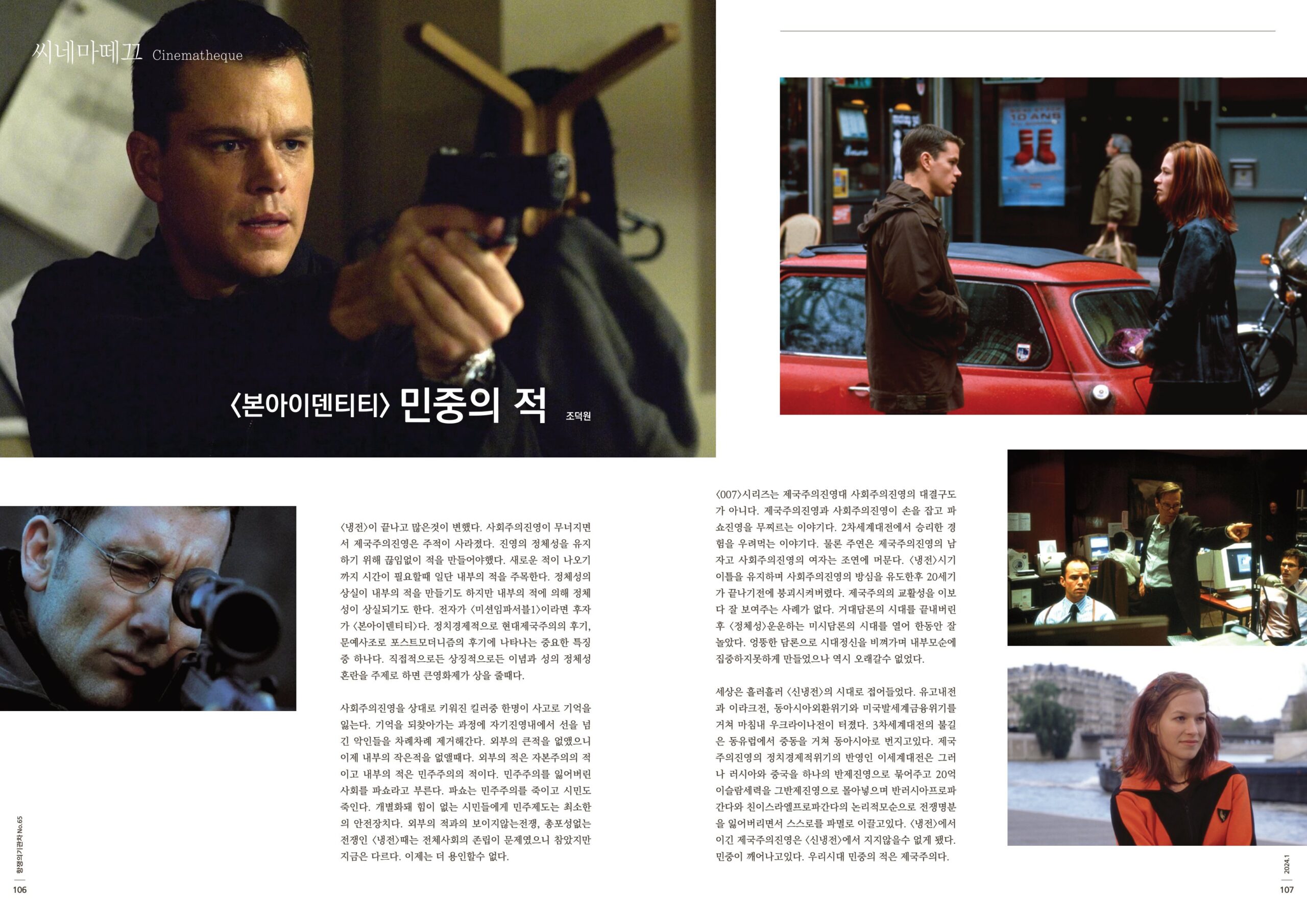 <냉전>이 끝나고 많은것이 변했다. 사회주의진영이 무너지면서 제국주의진영은 주적이 사라졌다. 진영의 정체성을 유지하기 위해 끊임없이 적을 만들어야했다. 새로운 적이 나오기까지 시간이 필요할때 일단 내부의 적을 주목한다. 정체성의 상실이 내부의 적을 만들기도 하지만 내부의 적에 의해 정체성이 상실되기도 한다. 전자가 <미션임파서블1>이라면 후자가 <본아이덴티티>다. 정치경제적으로 현대제국주의의 후기, 문예사조로 포스트모더니즘의 후기에 나타나는 중요한 특징중 하나다. 직접적으로든 상징적으로든 이념과 성의 정체성혼란을 주제로 하면 큰영화제가 상을 줄때다.