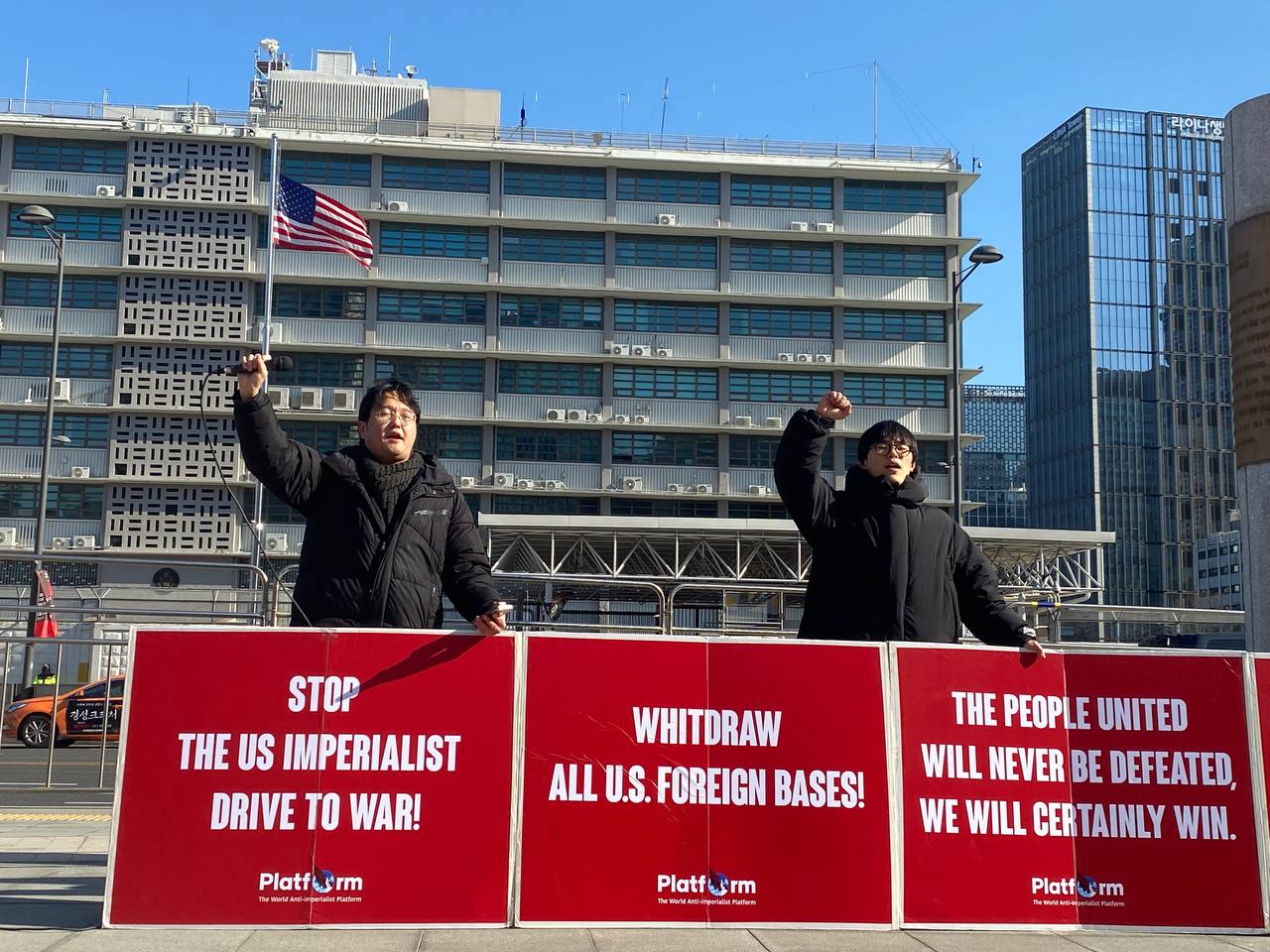 13일 서울 미대사관앞에서 민중민주당(민중당)서울시당당원들은 우리말과 영어로 된 구호피시 <미제국주의전쟁책동 반대! 전세계미군기지철거! 민중은 반드시 승리한다!>를 내세웠다.