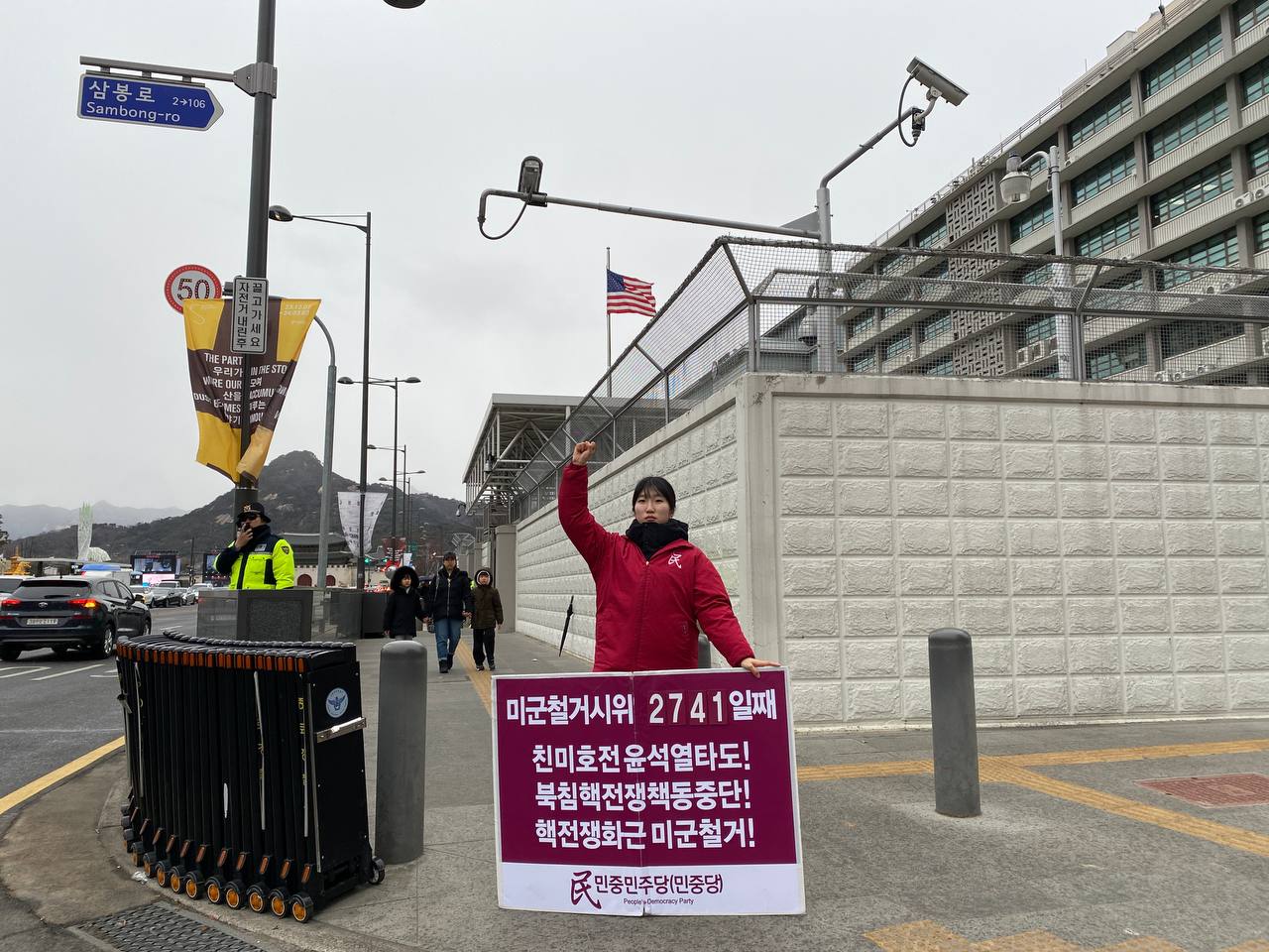 20일 민중민주당(민중당)은 미대사관앞에서 <친미호전윤석열타도! 북침핵전쟁책동중단! 핵전쟁화근 미군철거!> 구호를 들고 평화시위를 2741일째 전개했다.
