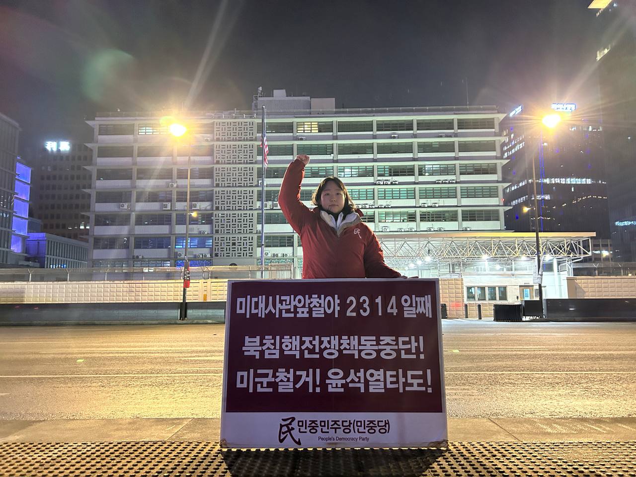 27일 민중민주당(민중당)은 미대사관앞에서 <친미호전윤석열타도! 북침핵전쟁책동중단! 핵전쟁화근 미군철거!> 구호를 들고 평화시위를 2748일째 전개했다.