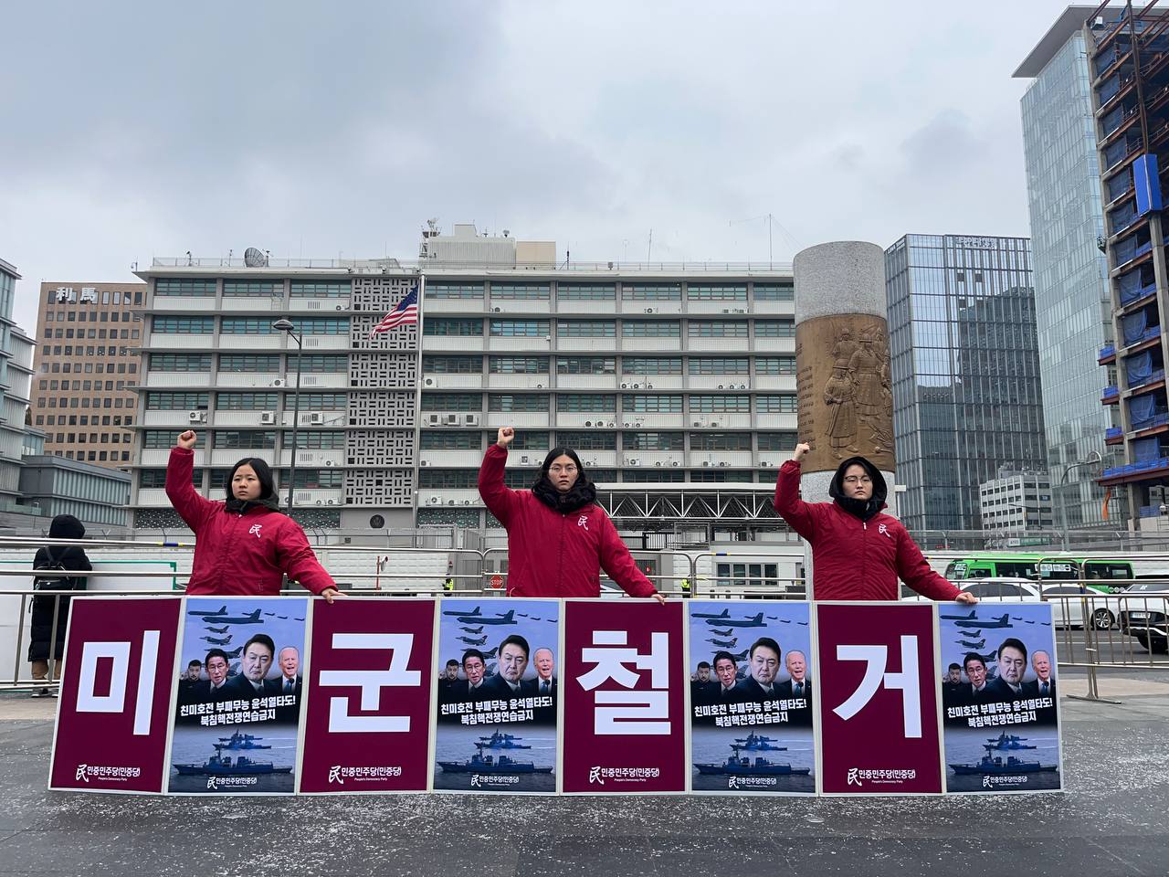 6일 민중민주당(민중당)은 미대사관앞에서 <친미호전윤석열타도! 북침핵전쟁책동중단! 핵전쟁화근 미군철거!> 구호를 들고 평화시위를 2758일째 전개했다.