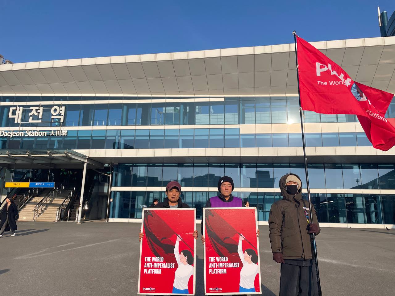 2일 대전역에서 민중민주당(민중당)당원들과 대전지역활동가들은 우리말과 영어로 된 구호피시 <미제국주의전쟁책동 반대! 전세계미군기지철거! 단결한 민중은 반드시 승리한다!>와 <Stop the us imperialist drive to war!> 등을 내세웠다.