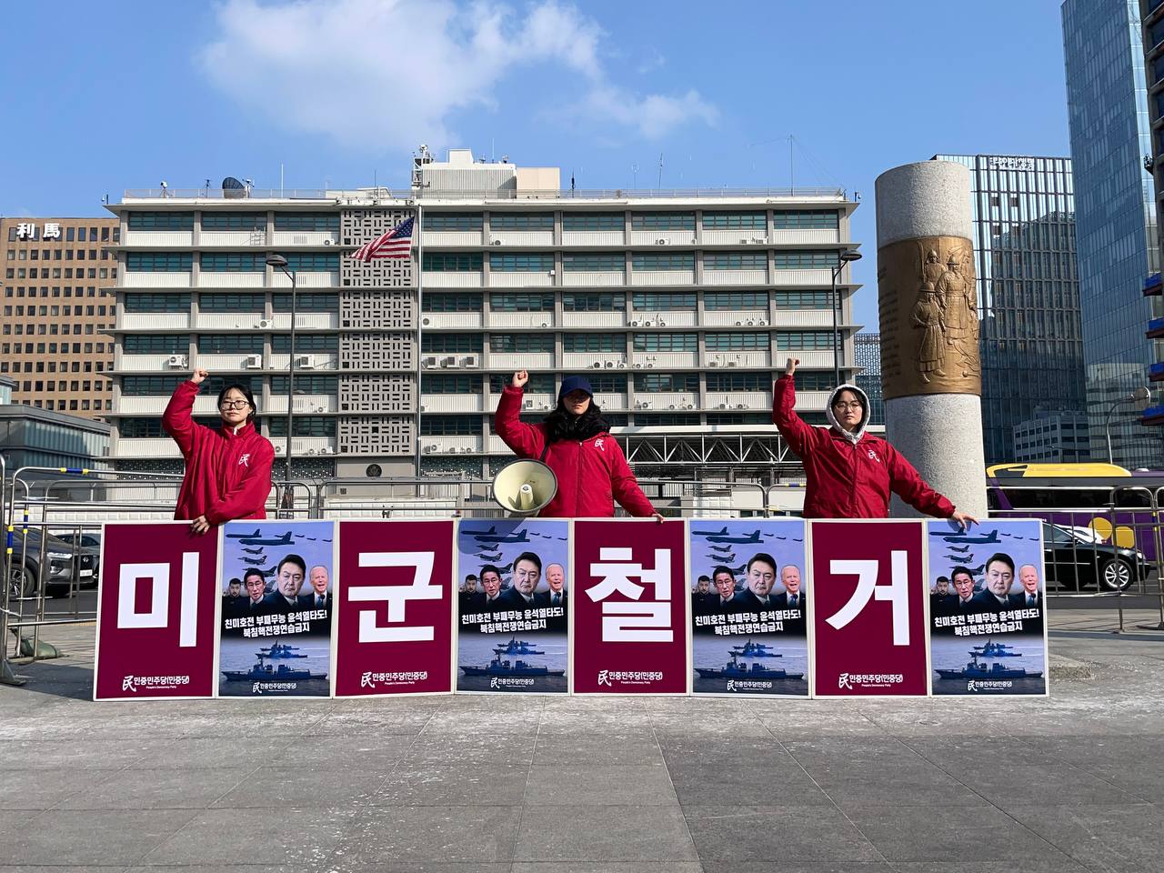 10일 민중민주당(민중당)은 미대사관앞에서 <친미호전윤석열타도! 북침핵전쟁책동중단! 핵전쟁화근 미군철거!> 구호를 들고 평화시위를 2762일째 전개했다.