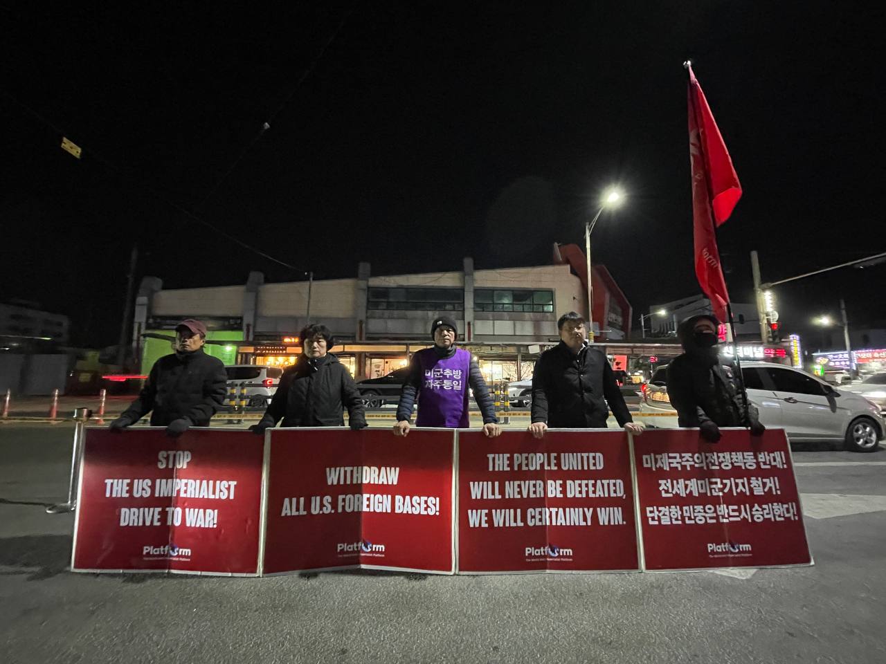 2일 공주터미널에서 민중민주당(민중당)충남도당당원들과 지역활동가들은 우리말과 영어로 된 구호피시 <미제국주의전쟁책동 반대! 전세계미군기지철거! 단결한 민중은 반드시 승리한다!>를 내세웠다.