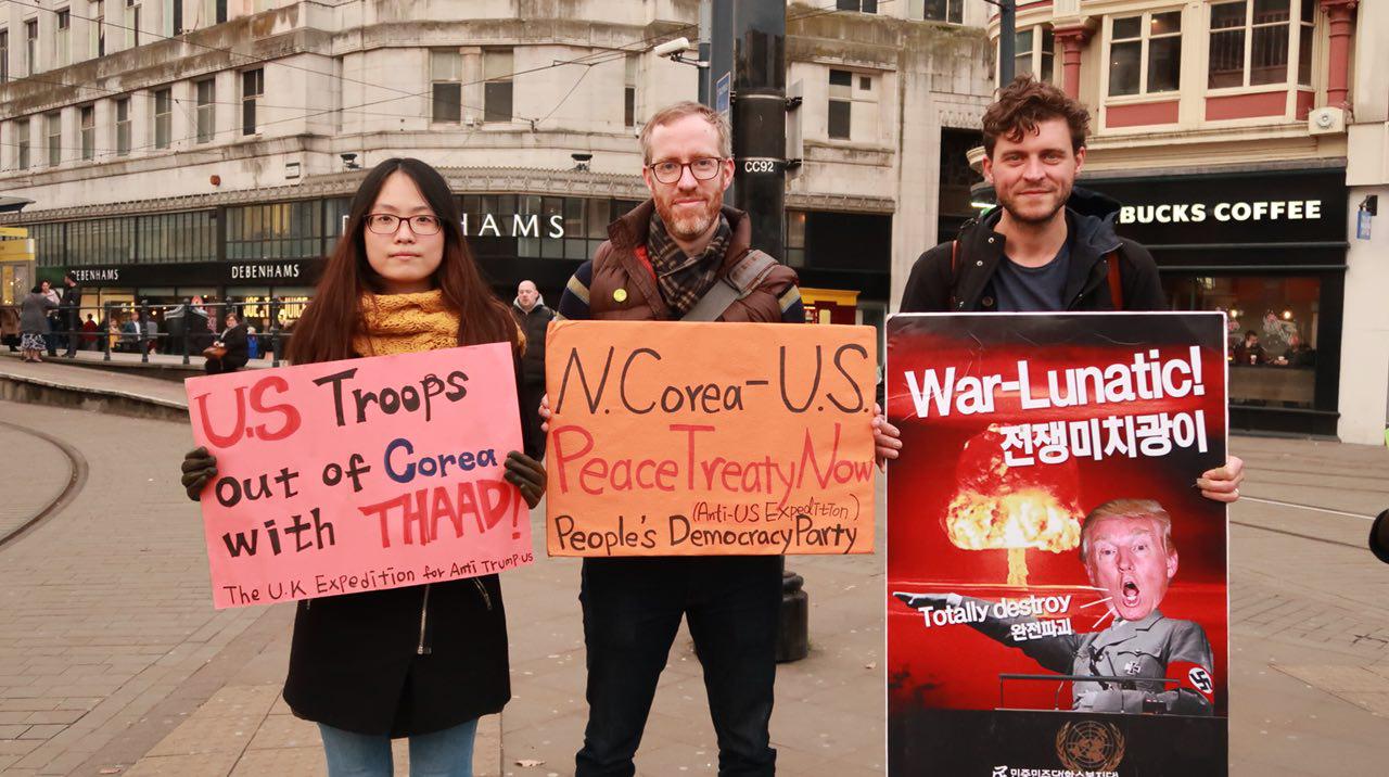 원정단은 맨체스터 번화가인 마켓스트리트 곳곳을 누비며 <트럼프는 전쟁미치광이!>·<트럼프 전쟁행각 결사반대!>·<No War! Peace Treaty Now!>등의 구호판을 들고 맨체스터 시민들이게 트럼프의 한국행각은 전쟁행각임을 알려나갔습니다.