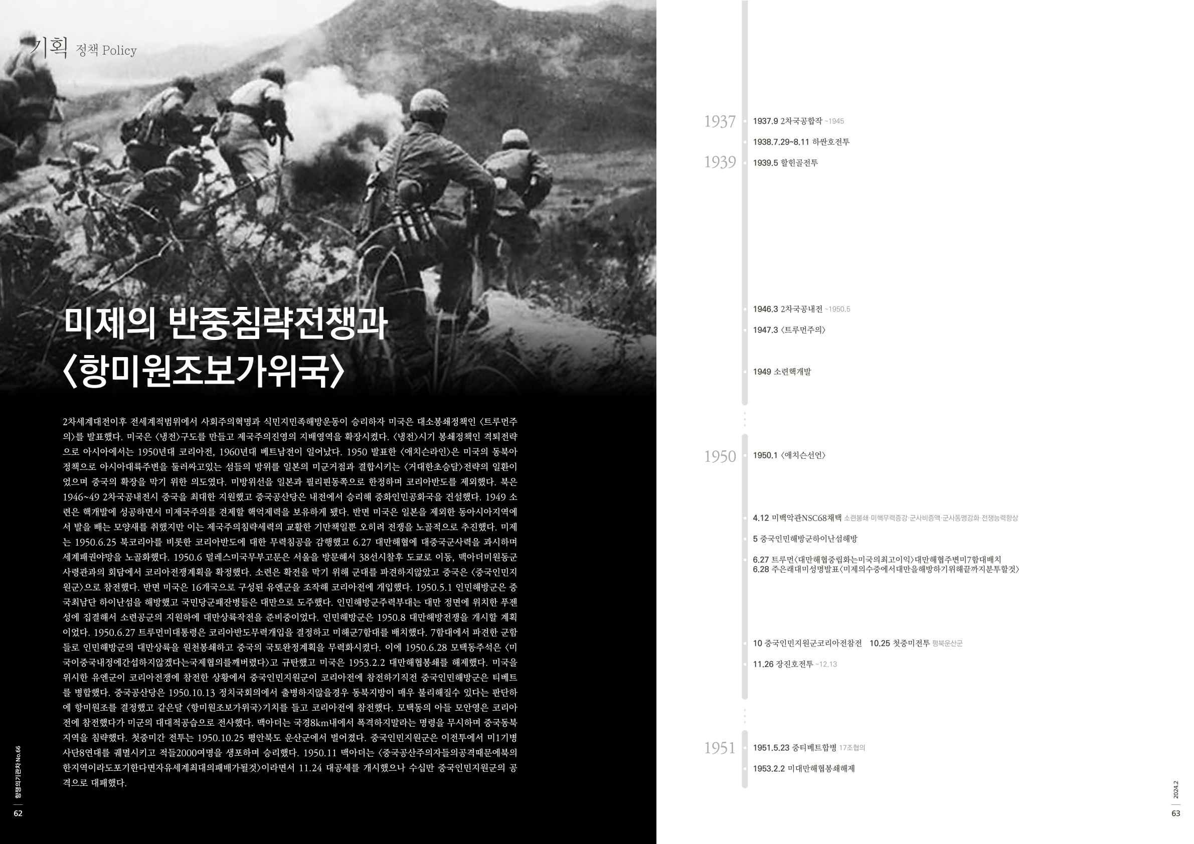 2차세계대전이후 전세계적범위에서 사회주의혁명과 식민지민족해방운동이 승리하자 미국은 대소봉쇄정책인 <트루먼주의>를 발표했다. 미국은 <냉전>구도를 만들고 제국주의진영의 지배영역을 확장시켰다. <냉전>시기 봉쇄정책인 격퇴전략으로 아시아에서는 1950년대 코리아전, 1960년대 베트남전이 일어났다. 1950 발표한 <애치슨라인>은 미국의 동북아정책으로 아시아대륙주변을 둘러싸고있는 섬들의 방위를 일본의 미군거점과 결합시키는 <거대한초승달>전략의 일환이었으며 중국의 확장을 막기 위한 의도였다. 미방위선을 일본과 필리핀동쪽으로 한정하며 코리아반도를 제외했다. 북은 1946~49 2차국공내전시 중국을 최대한 지원했고 중국공산당은 내전에서 승리해 중화인민공화국을 건설했다. 1949 소련은 핵개발에 성공하면서 미제국주의를 견제할 핵억제력을 보유하게 됐다. 반면 미국은 일본을 제외한 동아시아지역에서 발을 빼는 모양새를 취했지만 이는 제국주의침략세력의 교활한 기만책일뿐 오히려 전쟁을 노골적으로 추진했다. 미제는 1950.6.25 북코리아를 비롯한 코리아반도에 대한 무력침공을 감행했고 6.27 대만해협에 대중국군사력을 과시하며 세계패권야망을 노골화했다. 1950.6 덜레스미국무부고문은 서울을 방문해서 38선시찰후 도쿄로 이동, 맥아더미원동군사령관과의 회담에서 코리아전쟁계획을 확정했다. 소련은 확전을 막기 위해 군대를 파견하지않았고 중국은 <중국인민지원군>으로 참전했다. 반면 미국은 16개국으로 구성된 유엔군을 조작해 코리아전에 개입했다. 1950.5.1 인민해방군은 중국최남단 하이난섬을 해방했고 국민당군패잔병들은 대만으로 도주했다. 인민해방군주력부대는 대만 정면에 위치한 푸젠성에 집결해서 소련공군의 지원하에 대만상륙작전을 준비중이었다. 인민해방군은 1950.8 대만해방전쟁을 개시할 계획이었다. 1950.6.27 트루먼미대통령은 코리아반도무력개입을 결정하고 미해군7함대를 배치했다. 7함대에서 파견한 군함들로 인민해방군의 대만상륙을 원천봉쇄하고 중국의 국토완정계획을 무력화시켰다. 이에 1950.6.28 모택동주석은 <미국이중국내정에간섭하지않겠다는국제협의를깨버렸다>고 규탄했고 미국은 1953.2.2 대만해협봉쇄를 해제했다. 미국을 위시한 유엔군이 코리아전쟁에 참전한 상황에서 중국인민지원군이 코리아전에 참전하기직전 중국인민해방군은 티베트를 병합했다. 중국공산당은 1950.10.13 정치국회의에서 출병하지않을경우 동북지방이 매우 불리해질수 있다는 판단하에 항미원조를 결정했고 같은달 <항미원조보가위국>기치를 들고 코리아전에 참전했다. 모택동의 아들 모안영은 코리아전에 참전했다가 미군의 대대적공습으로 전사했다. 맥아더는 국경8km내에서 폭격하지말라는 명령을 무시하며 중국동북지역을 침략했다. 첫중미간 전투는 1950.10.25 평안북도 운산군에서 벌어졌다. 중국인민지원군은 이전투에서 미1기병사단8연대를 궤멸시키고 적들2000여명을 생포하며 승리했다. 1950.11 맥아더는 <중국공산주의자들의공격때문에북의한지역이라도포기한다면자유세계최대의패배가될것>이라면서 11.24 대공세를 개시했으나 수십만 중국인민지원군의 공격으로 대패했다.