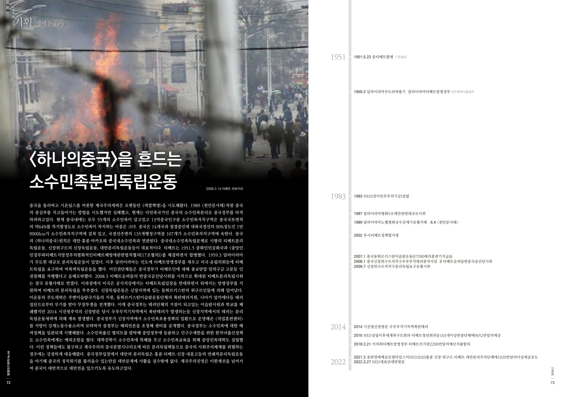 중국을 둘러싸고 시온딥스를 비롯한 제국주의세력은 오랫동안 <색깔혁명>을 시도해왔다. 1989 <천안문사태>처럼 중국의 중심부를 치고들어가는 방법을 시도했지만 실패했고, 현재는 다민족국가인 중국의 소수민족분리로 중국정부를 타격하려하고있다. 현재 중국내에는 모두 55개의 소수민족이 살고있고 13억중국인구중 소수민족자치구역은 중국국토면적의 약64%를 차지할정도로 소수민족이 차지하는 비중은 크다. 중국은 14개국과 접경중인데 내륙국경선의 90%정도인 1만9000km가 소수민족자치구역에 걸쳐 있고, 국경선주변의 135개행정구역중 107개가 소수민족자치구역에 속한다. 중국의 <하나의중국>원칙은 대만·홍콩·마카오와 중국내소수민족과 연관된다. 중국내소수민족독립문제로 시짱의 티베트분리독립운동, 신장위구르의 신장독립운동, 대만분리독립운동등이 대표적이다. 티베트는 1951.5 중화인민공화국과 <중앙인민정부와티베트지방정부의평화적인티베트해방에관한법적협의(17조협의)>를 체결하면서 합병했다. 1959.3 달라이라마가 주도한 대규모 분리독립운동이 있었다. 이후 달라이라마는 인도에 티베트망명정부를 세우고 미국·유럽의회등에 티베트독립을 요구하며 비폭력독립운동을 했다. 미인권단체들은 중국정부가 티베트인에 대해 종교탄압·임의구금·고문등 인권침해를 자행했다고 음해모략했다. 2008.3 티베트승려들의 반중국공산당시위를 시작으로 확대된 티베트분리독립시위는 결국 유혈사태로 번졌다. 이과정에서 미국은 공식석상에서는 티베트독립입장을 반대하면서 뒤에서는 망명정부를 지원하며 티베트의 분리독립을 부추겼다. 신장독립운동은 신장지역에 있는 동튀르키스탄의 위구르인들에 의해 일어났다. 이운동의 주도세력은 주변이슬람국가들의 지원, 동튀르키스탄이슬람운동단체의 폭탄테러지원, 나아가 알카에다등 테러집단으로부터 무기를 받아 무장투쟁을 전개했다. 이에 중국정부는 테러단체의 거점이 되고있는 이슬람사원과 학교를 폐쇄했지만 2014 시진핑주석의 신장방문 당시 우루무치기차역에서 폭탄테러가 발생하는등 신장지역에서의 테러는 분리독립운동세력에 의해 계속 발생했다. 중국정부가 신장지역에서 소수민족포용정책의 일환으로 운영해온 <직업훈련센터>를 서방이 강제노동수용소라며 모략하자 중정부는 해외언론을 초청해 센터를 공개했다. 중국정부는 소수민족에 대한 배려정책을 일관되게 시행해왔다. 소수민족출신 엘리트를 발탁해 중앙정부에 등용하고 인구수제한을 위한 한자녀출산정책도 소수민족에게는 예외조항을 뒀다. 대학진학시 소수민족에 특혜를 주고 소수민족교육을 위해 중앙민족대학도 설립했다. 이런 정책들에도 불구하고 제국주의의 중국분열시나리오에 따른 분리독립책동으로 중국의 사회주의체제를 위협하는경우에는 강경하게 대응해왔다. 중국정부입장에서 대만의 분리독립은 홍콩·티베트·신장·내몽고등의 연쇄적분리독립운동을 야기해 중국의 정치위기를 불러올수 있는만큼 대만문제에 사활을 걸수밖에 없다. 제국주의진영은 이한계선을 넘어서며 중국이 대반격으로 대만전을 일으키도록 유도하고있다.
