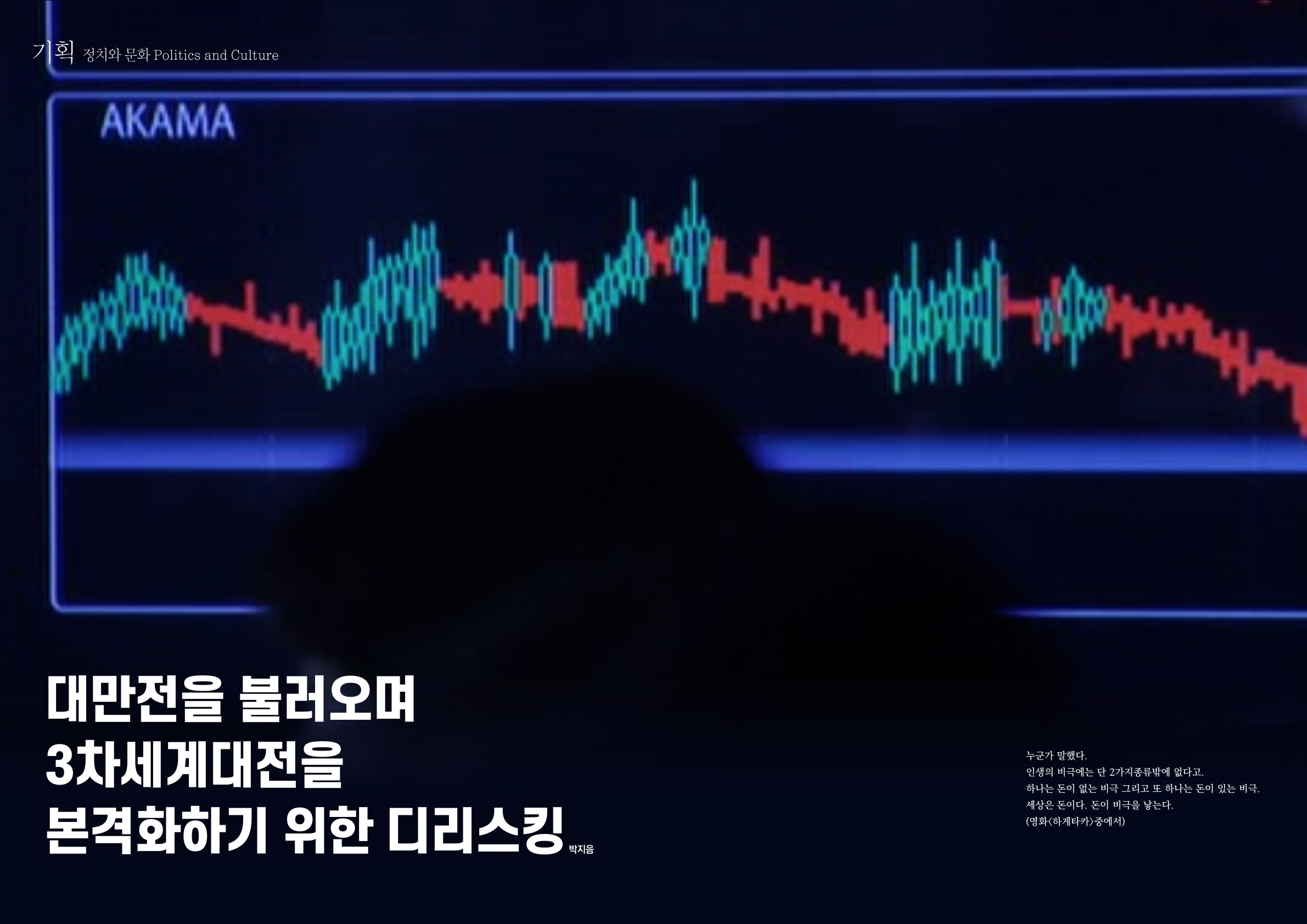 항쟁의기관차 〈2024.2 항쟁의기관차〉 대만전을 불러오며 3차세계대전을 본격화 하기 위한 디리스킹 2024년 2월 21일 FacebookTwitter 누군가 말했다. 인생의 비극에는 단 2가지종류밖에 없다고. 하나는 돈이 없는 비극 그리고 또 하나는 돈이 있는 비극. 세상은 돈이다. 돈이 비극을 낳는다. (영화<하게타카>중에서)