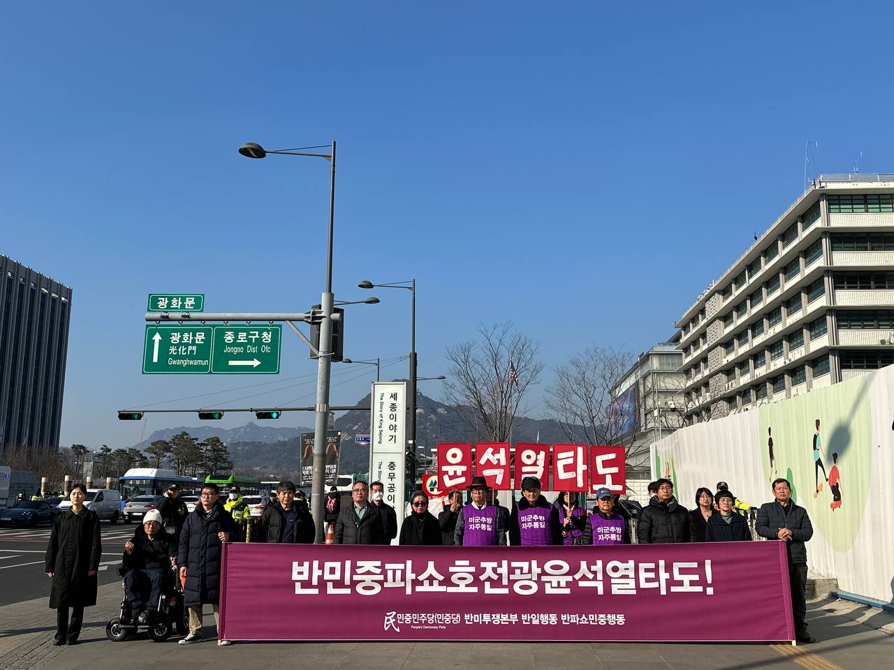 참가자들은 <반민중파쇼광 윤석열 타도하자!>, <북침전쟁책동 윤석열 타도하자!>, <윤석열 타도하고 민중민주 실현하자!>, <동아시아핵전쟁도발 미군 철거하라!> 구호를 힘차게 외쳤다.