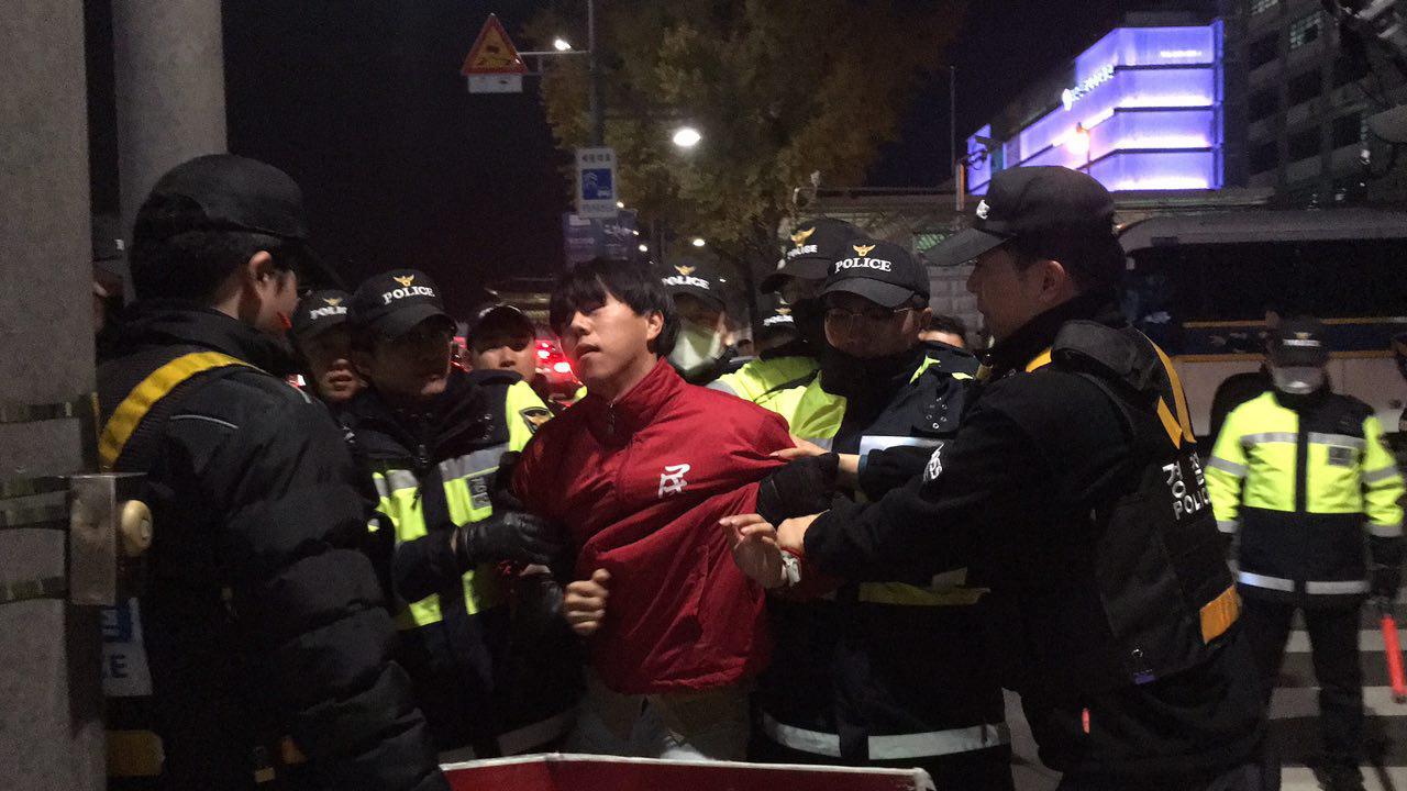 경찰들은 이날도 미대사관앞 평화적인 1인시위를 방해하면서 강제적으로 이격조치했습니다.