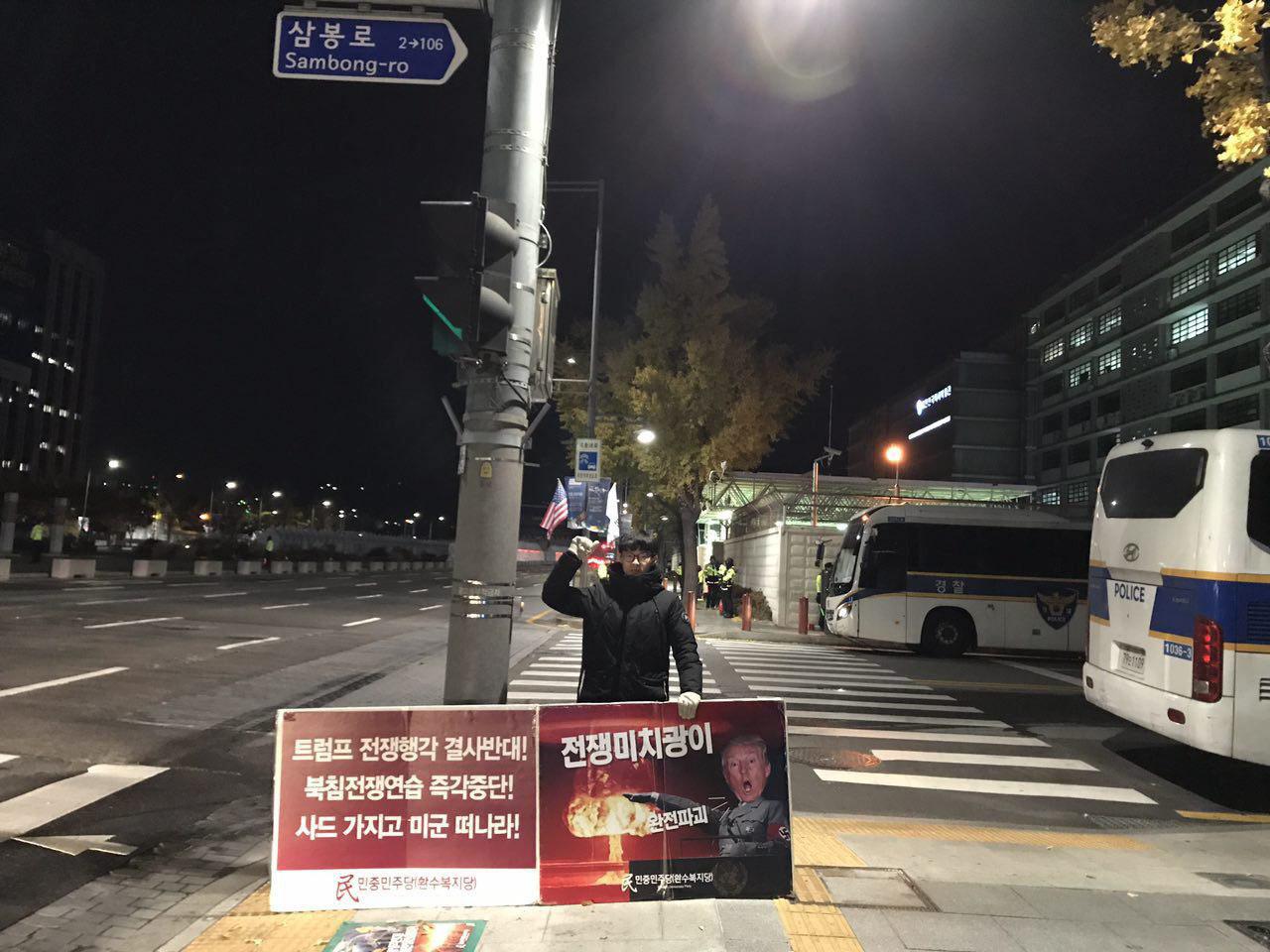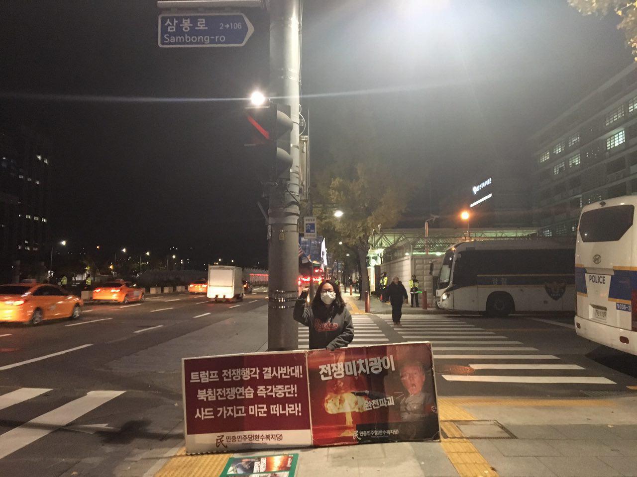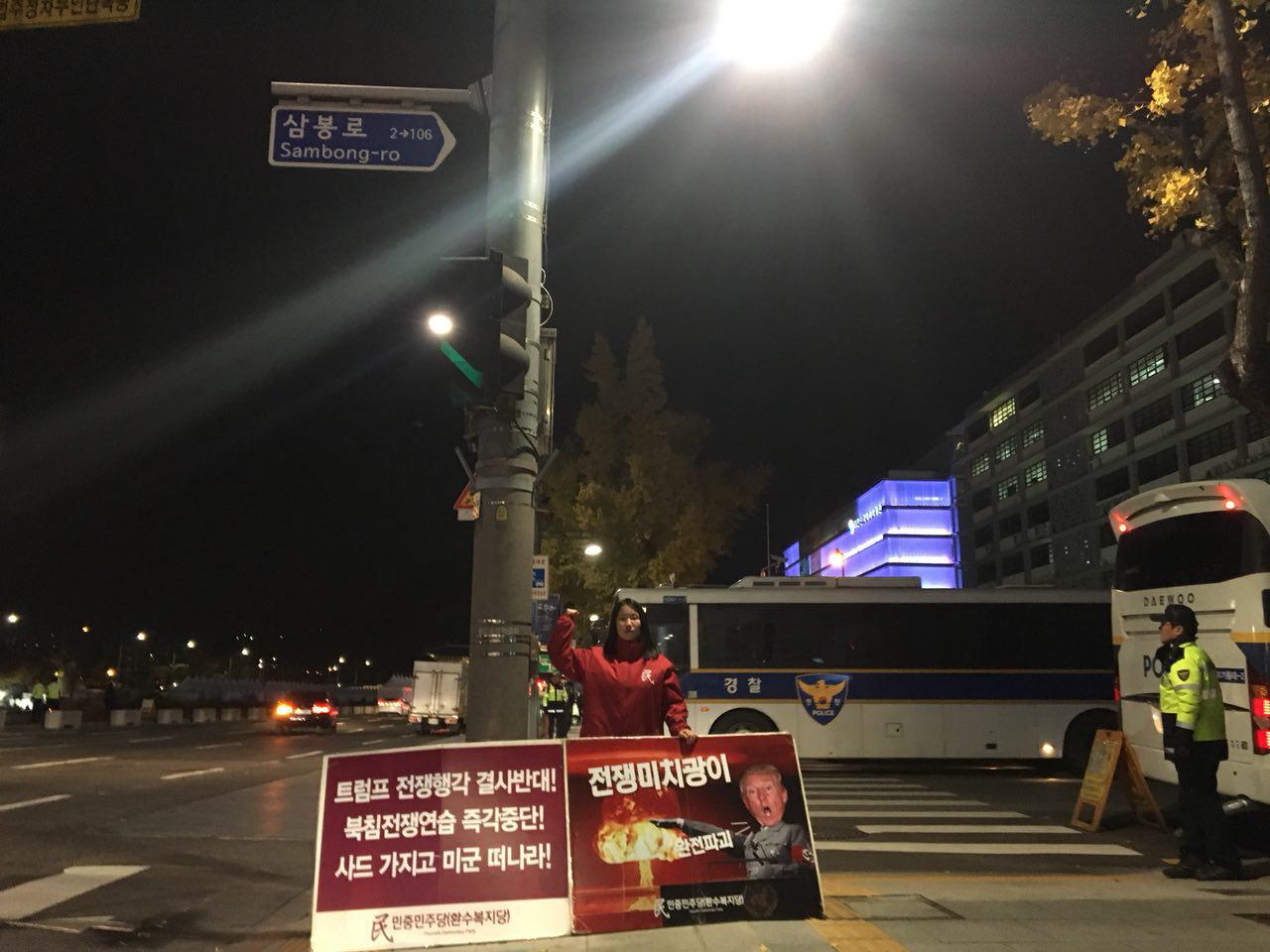 당원들은 이 시간에도 <트럼프는 전쟁미치광이!>·<북침전쟁연습 중단!>·<사드 가지고 미군 떠나라!> 구호와 핵전쟁을 일으키는 <21세기히틀러> 트럼프 이미지위에 <전쟁미치광이!> 구호가 적힌 구호판을 들고 24시간 1인시위를 진행하고 있습니다.