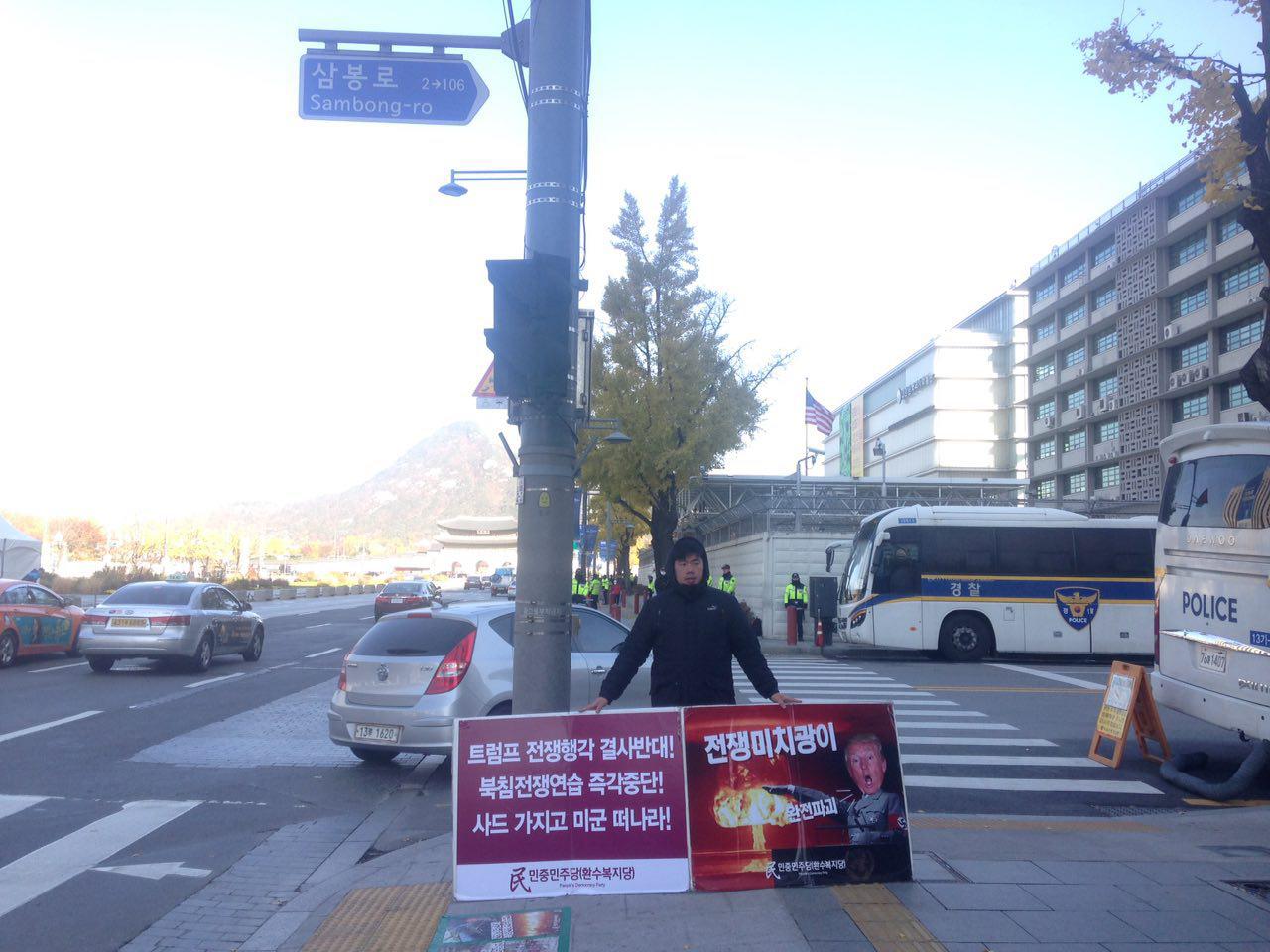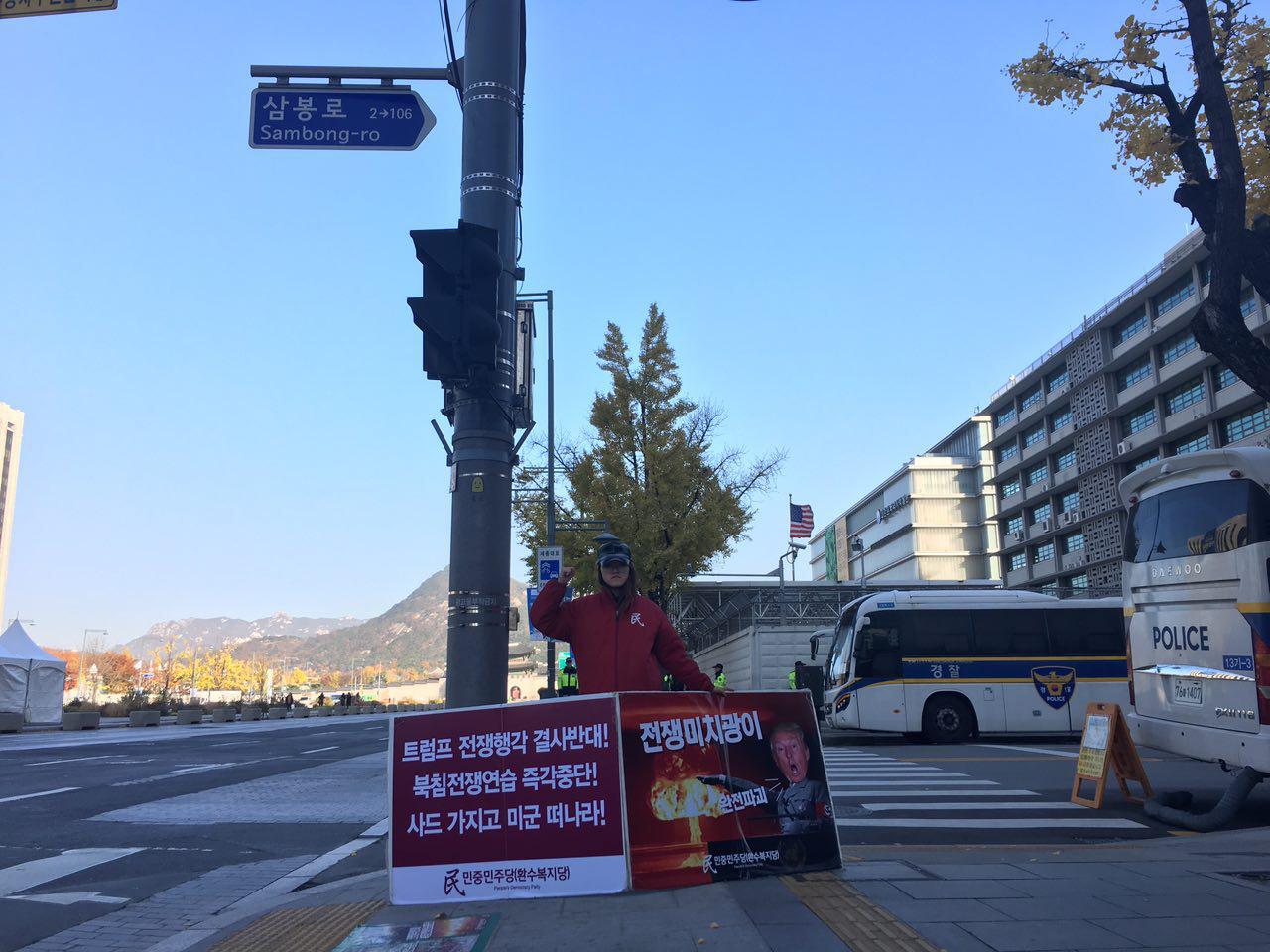 트럼프의 전쟁행각이후 11일부터 13일까지 한반도 인근 해상에서 3개 핵항모강습단이 참가하는 한미합동북침전쟁연습이 벌어지는 것을 규탄하며 당원들은 오늘부터 <북침전쟁연습 중단!>·<전쟁광 트럼프 끝장내자!>·<사드 가지고 미군 떠나라!> 새 구호판과 트럼프 <전쟁미치광이!> 구호판을 들고 24시간 1인시위를 진행했습니다.