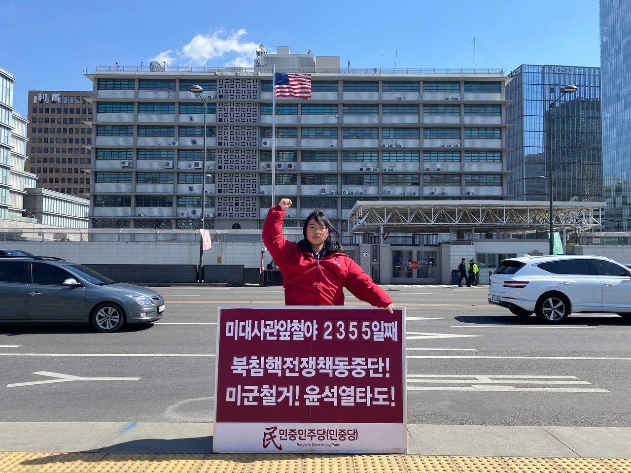 8일 민중민주당(민중당)은 미대사관앞에서 <친미호전윤석열타도! 북침핵전쟁책동중단! 핵전쟁화근 미군철거!> 구호를 들고 평화시위를 2788일째 전개했다.