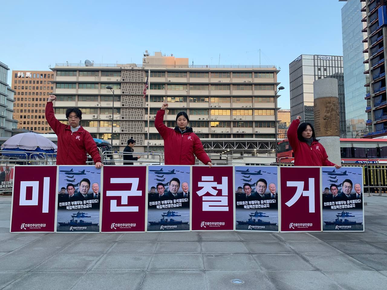 미대사관정문 맞은편에서는 우리말과 영어로 된 구호 <북침핵전쟁책동중단! 미군철거! 윤석열타도!>를 들고 <광화문미대사관앞철야시위>를 진행했다.