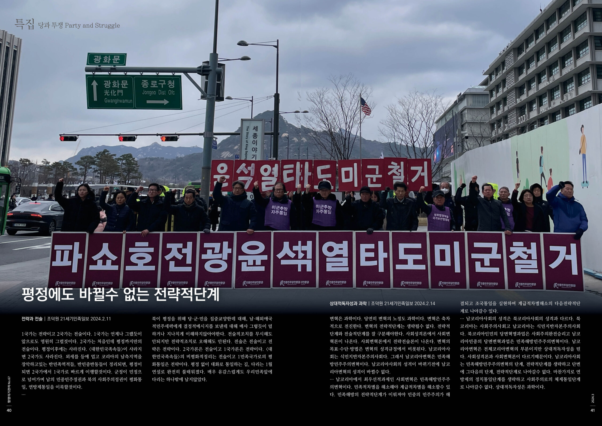 … 남코리아에서 최우선적과제인 사회변혁은 민족해방민주주의변혁이다. 민족적차별을 해소해야 계급적차별을 해소할수 있다. 민족해방의 전략적단계가 이뤄져야 민중의 민주주의가 해결되고 조국통일을 실현하며 계급적차별해소의 다음전략적단계로 나아갈수 있다.