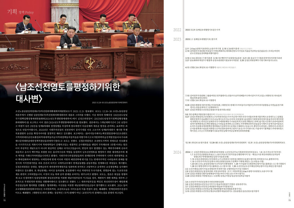 조선노동당중앙위원회8기9차전원회의확대회의에관한보도가 2023.12.31 발표됐다. 보도는 12.26~30 조선노동당중앙위본부에서 진행된 당중앙위8기9차전원회의확대회의의 내용과 그의의를 다뤘다. 이날 회의의 첫째의정 <2023년도당및국가정책집행정형에대한총화와2024년도투쟁방향에대하여>에서 김정은위원장이 <2023년도당및국가정책집행정형총화에대하여>를 보고하고 이어 결론<2024년도투쟁방향에대하여>를 발표했다. 결론에서는 5개년계획기간이 2년 남았다고 하면서 남은 2년간을 당제8차대회 결정집행을 착실하게 결속하면서 다음단계의 새로운 발전을 준비하는 효과적인 과정으로 만들어야합니다, 2024년은 사회주의건설의 전전선에서 공격기세를 더욱 고조시켜 당제8차대회가 제시한 투쟁목표점령의 승산을 확정지어야할 결정적인 해라고 강조했다. 보고에서는 <총비서동지께서는핵전쟁접경에이른조선반도지역의위태로운안보환경과적대세력들의군사적대결책동의성격을분석평가하시고국가방위력의급진적발전을더욱가속화해나갈데대한중대한정책적결단을천명하시였다>고 보도는 전했다. 김정은위원장은 조선반도지역의 위태로운 안보환경을 시시각각으로 격화시키며 적대세력들이 감행하고있는 대결적인 군사행위들을 면밀히 주목해보면 <전쟁>이라는 말은 이미 추상적인 개념으로가 아니라 현실적인 실체로 다가오고있습니다, 만일의 경우 발생할수 있는 핵위기사태에 신속히 대응하고 유사시 핵무력을 포함한 모든 물리적수단과 역량을 동원하여 남조선전영토를 평정하기 위한 대사변준비에 계속 박차를 가해나가야하겠습니다라고 밝혔다. 사회주의나라집권당들과의 관계발전에 주력하면서 나라의 대외영역을 보다 확대강화하며 변천하는 국제정세에 맞게 미국과 서방의 패권전략에 반기를 드는 반제자주적인 나라들과의 관계를 발전시켜 지지연대기반을 더욱 튼튼히 다지고 국제적규모에서 반제공동행동·공동투쟁을 전개해나갈 과업들도 제시됐다. 김정은위원장은 강대강, 정면승부의 대미대적투쟁원칙을 일관하게 견지하고 고압적이고 공세적인 초강경정책을 실시해야하겠다고 강조했다. 또 북남관계는 더이상 동족관계, 동질관계가 아닌 적대적인 두국가관계, 전쟁중에 있는 두교전국관계로 완전히 고착되였습니다, 이것이 오늘 북과 남의 관계를 보여주는 현주소라고 밝혔다. 보도는, 결론은 현실을 냉철하게 보고 인정하면서 당중앙위원회 통일전선부를 비롯한 대남사업부문의 기구들을 정리, 개편하기 위한 대책을 세우며 근본적으로 투쟁원칙과 방향을 전환해야한다고 강조했다고 전했다. 1.1 대외사업부문을 책임진 최선희외무상이 해당관계부문일군들과 협의회를 진행했고 협의회에는 이선권을 비롯한 대남관계부문일군들이 참가했다고 보도됐다. 2024 들어 조국평화통일위원회사이트인 우리민족끼리, 조선의오늘등 사이트들의 이용·연결이 중단, 폐쇄됐다. 반제민족민주전선사이트도 폐쇄됐다. <대한민국>과의 관계는 정상적인 <국가>관계가 아닌 <교전국가>의 관계라는점을 분명히 하고있다.
