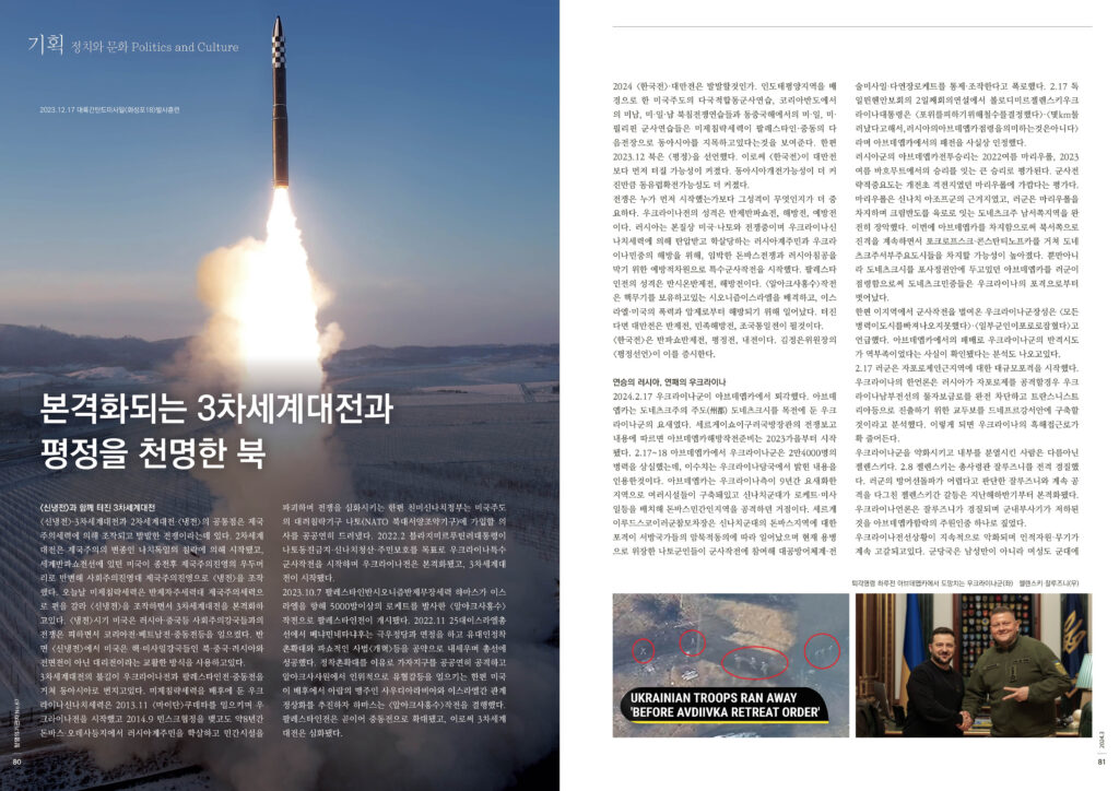 2024 <한국전>·대만전은 발발할것인가. 인도태평양지역을 배경으로 한 미국주도의 다국적합동군사연습, 코리아반도에서의 미남, 미·일·남 북침전쟁연습들과 동중국해에서의 미·일, 미·필리핀 군사연습들은 미제침략세력이 팔레스타인·중동의 다음전장으로 동아시아를 지목하고있다는것을 보여준다. 한편 2023.12 북은 <평정>을 선언했다. 이로써 <한국전>이 대만전보다 먼저 터질 가능성이 커졌다. 동아시아개전가능성이 더 커진만큼 동유럽확전가능성도 더 커졌다.