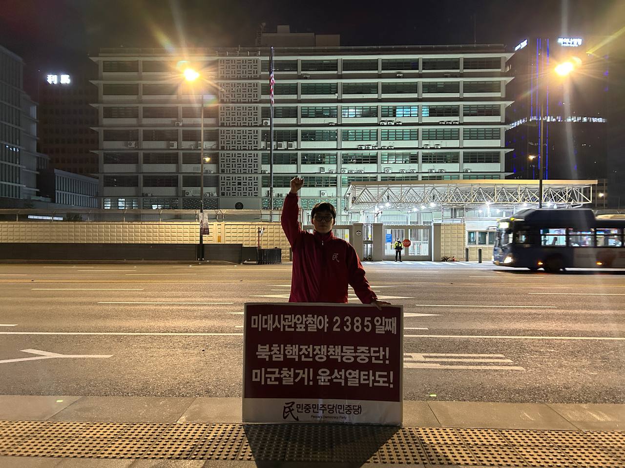 7일 민중민주당(민중당)은 미대사관앞에서 <친미호전윤석열타도! 북침핵전쟁책동중단! 핵전쟁화근 미군철거!> 구호를 들고 평화시위를 2818일째 전개했다.