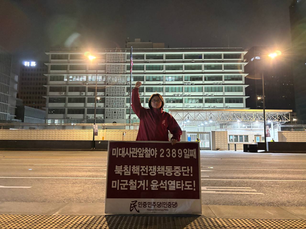 11일 민중민주당(민중당)은 미대사관앞에서 <친미호전윤석열타도! 북침핵전쟁책동중단! 핵전쟁화근 미군철거!> 구호를 들고 평화시위를 2822일째 전개했다.
