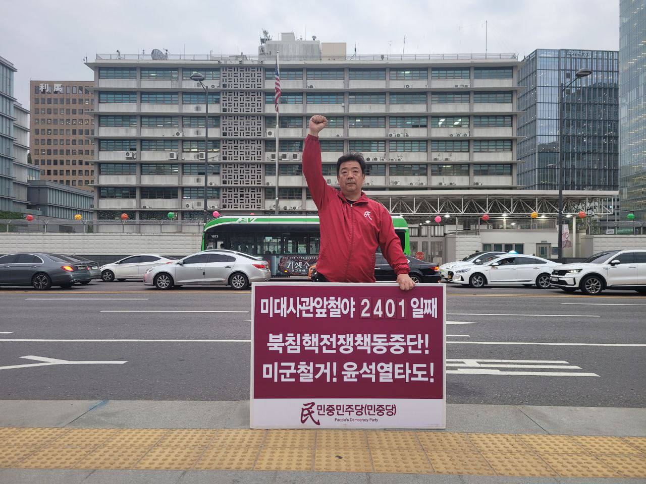 23일 민중민주당(민중당)은 미대사관앞에서 <친미호전윤석열타도! 북침핵전쟁책동중단! 핵전쟁화근 미군철거!> 구호를 들고 평화시위를 2834일째 전개했다.