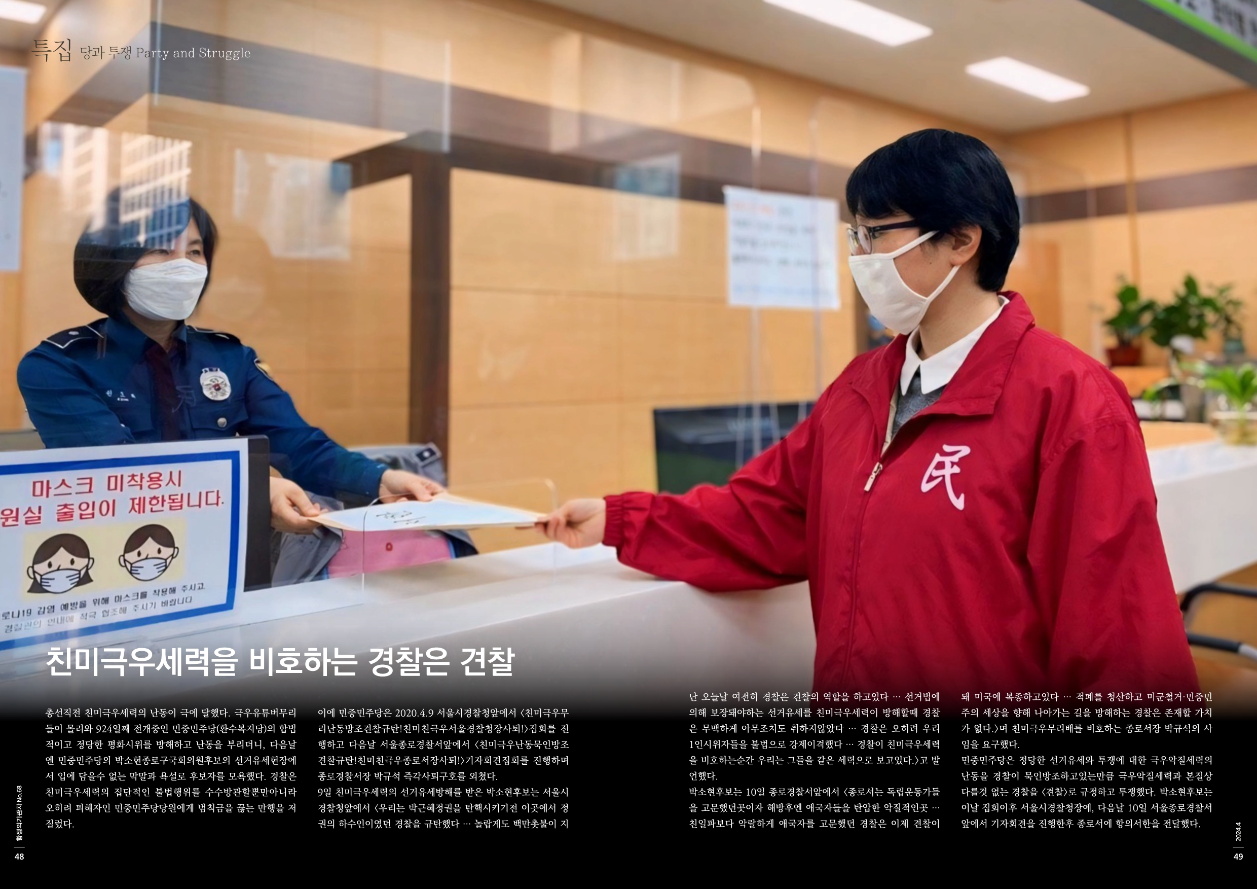 총선직전 친미극우세력의 난동이 극에 달했다. 극우유튜버무리들이 몰려와 924일째 전개중인 민중민주당(환수복지당)의 합법적이고 정당한 평화시위를 방해하고 난동을 부리더니, 다음날엔 민중민주당의 박소현종로구국회의원후보의 선거유세현장에서 입에 담을수 없는 막말과 욕설로 후보자를 모욕했다. 경찰은 친미극우세력의 집단적인 불법행위를 수수방관할뿐만아니라 오히려 피해자인 민중민주당당원에게 범칙금을 끊는 만행을 저질렀다.