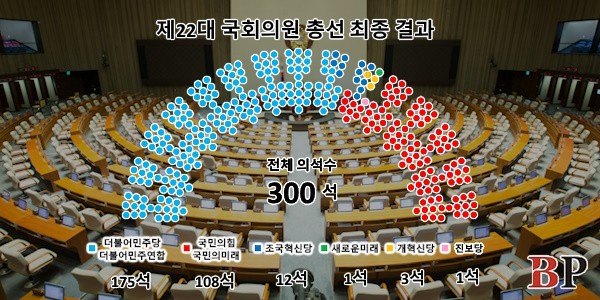 2024.4 22대총선은 2022.5 취임한 윤석열정부에 대한 평가다. 일반적으로는 중간평가이지만 이번총선은 어느때보다 <정권심판>·<탄핵>·<타도>가 높이 울렸다. 민주당은 여당으로서 180석의 다수의석을 차지했지만 2년만에 대선에서 패배해 야당이 됐다. 180석을 다 유지하지는 못했지만 다수의석을 갖고있었고 여당인 국민당은 114석의 의석으로 대통령이 거부권을 행사하면 재의결에 부결을 하는정도밖에 못하는 신세였다. 그럼에도 민주당의 개혁법안들은 윤석열의 대통령거부권행사로 입법이 막혔다. 이를 위해 윤석열정부는 야당과 협의해야하는 입법을 포기하고 이른바<시행령정치>를 했다. 정권심판론이 휩쓴 이번선거에서 32년만에 최고치의 투표율을 기록했다. 사전투표율도 31.28%로 사전투표시행이후 최고치를 기록했다. 지역구총254석은 민주당161석 국민당90석 개혁신당·새로운미래·진보당각1석, 비례총46석은 국민의미래18석(36.67%) 더불어민주연합14석(26.69%) 조국혁신당12석(24.25%) 개혁신당2석(3.61%)으로 집계됐다. 더불어민주연합14석은 민주당10석·진보당2석·기본소득당1석·사회민주당1석이다. 범야권총192석은 민주당171석·조국혁신당12석·개혁신당3석·진보당3석·새로운미래1석·기본소득당1석·사회민주당1석이다. 국민당(국민의힘·국민의미래)은 108석이다. 윤석열·국민당의 거부권행사를 저지할수 있는 범야권의 200석획득에는 성공하지못했지만 선거에 득표로 그에 가까운 지지를 확인한만큼 윤석열정부도 쉽게 거부권을 행사하기는 어려울것이라는 전망이다. <대한민국>헌정사상으로도 이런 압도적과반은 유례가 없는 일이다. 한동훈은 <200석을가지고뭐한다고얘기하지않느냐>며 <무시무시한일이벌어질것이고,나라가무너질수있다>며 겁박하고 한편으로 한동훈도 정권심판심리를 의식해 2년밖에 되지 않았나, 부족한게 있는줄 안다, 그런데 100일동안 제가 어떻게든 소통하고 해결하지않았냐, 저를 믿고 한번 맡겨달라고 읍소했다. 윤석열의 이종섭호주대사임명·<대파>논란, 한동훈의 막말유세등으로 윤석열·국민당은 선거전에서 내내 열세였다. 마지막에는 이것이 오히려 위기감을 낳으며 보수를 결집시켰다. 여야가 모두 사활적으로 나서면서 투표율도 높아졌지만 다른 한편으로 양당으로 결집하게 되고 이것이 결국 지역구도도 강화시켰다. 22대총선은 정권심판이냐 아니냐만 남았다고 할정도로 첨예하게 진행됐다. 이번 총선에서 정권심판론의 돌풍을 일으킨 조국혁신당은 4.11 대검찰청을 찾아가 검찰은 즉각 김건희를 소환해 조사하라며 대정부투쟁을 선언했다. 조국은 자녀들의입시비리및청와대감찰무마혐의등으로 항소심에서 2년실형을 선고받아 상고심판결만 남겨두고있다. 항소심재판부에서 법정구속하지않아 구속되지않은 상태에서 선거전을 치를수 있었지만 상고심에서 금고이상의 형이 확정되면 의원직이 박탈되고 구속된다. 4.11 상고심재판부가 배당됐다. 민주당의 이재명·박지원, 조국혁신당의 황운하등도 현재 재판이 진행중으로 형이 확정될경우 의원직을 상실한다. <검찰정권>에 맞선 야당의 처지기도 하지만 22대국회가 반윤석열투쟁을 빠르게 결속짓지않으면 안되는 이유기도 하다.