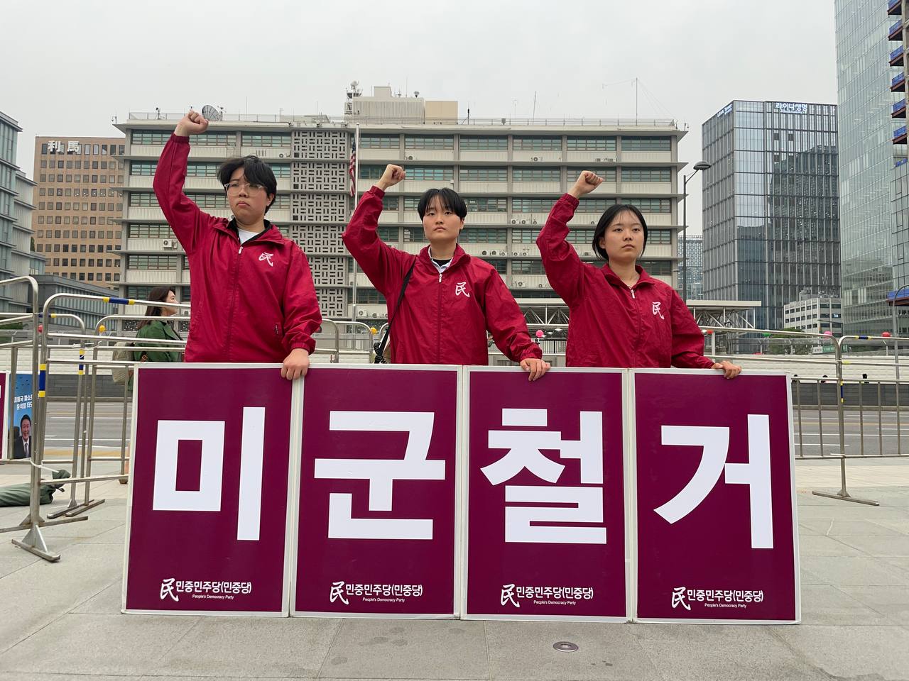 30일 민중민주당(민중당)은 미대사관앞에서 <친미호전윤석열타도! 북침핵전쟁책동중단! 핵전쟁화근 미군철거!> 구호를 들고 평화시위를 2841일째 전개했다.