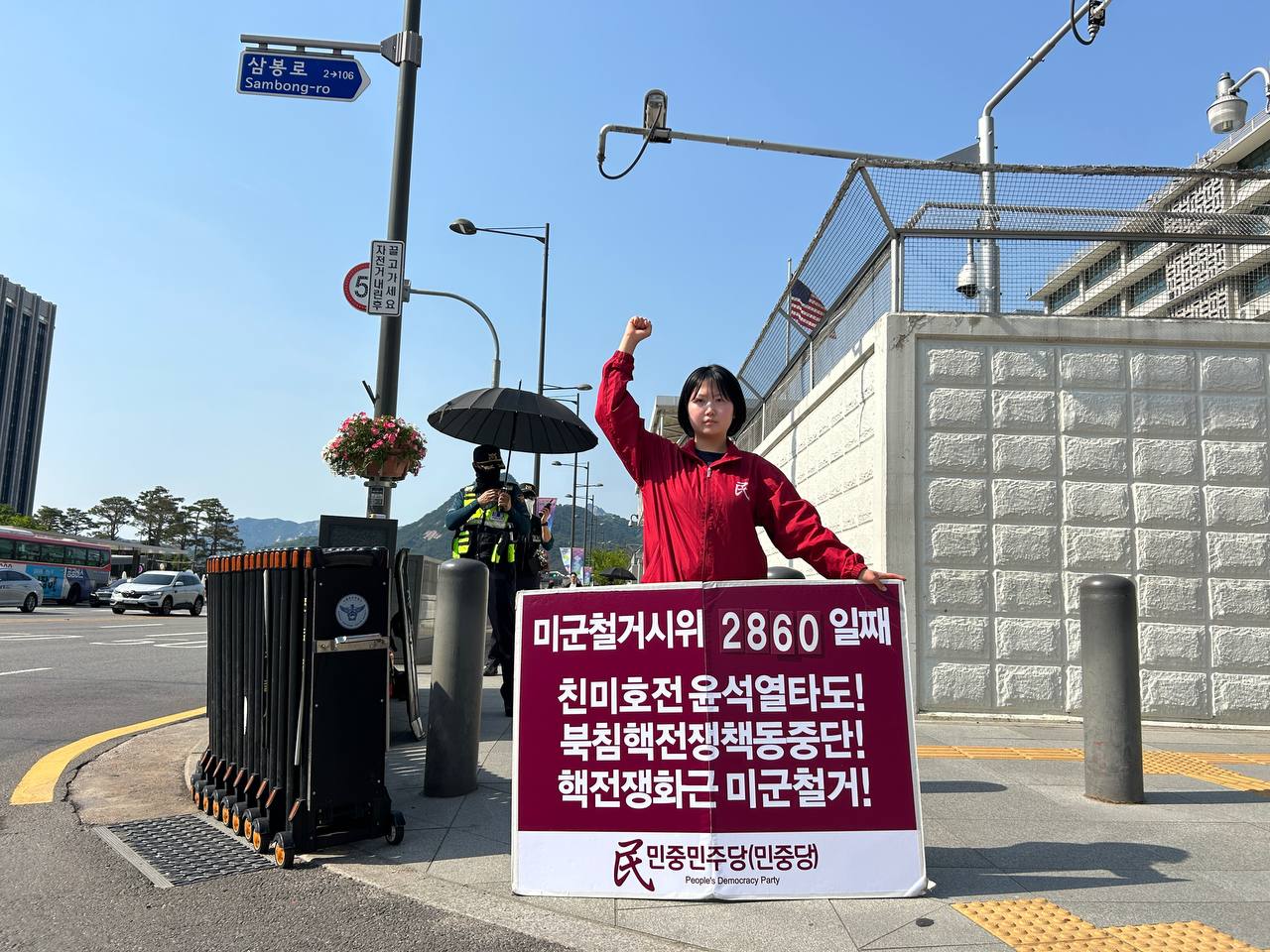 19일 민중민주당(민중당)은 미대사관앞에서 <친미호전윤석열타도! 북침핵전쟁책동중단! 핵전쟁화근 미군철거!> 구호를 들고 평화시위를 2860일째 전개했다.