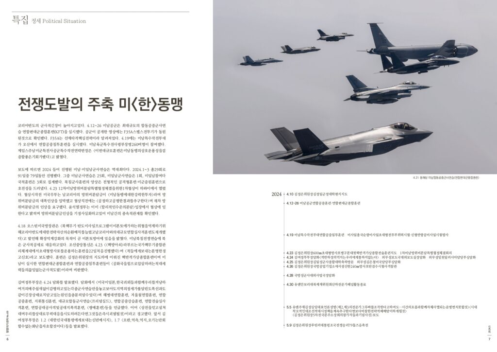 코리아반도의 군사적긴장이 높아지고있다. 4.12~26 미남공군은 최대규모의 합동공중군사연습 연합편대군종합훈련(KFT)을 실시했다. 공군이 공개한 영상에는 F35A스텔스전투기가 동원된것으로 확인됐다. F35A는 선제타격핵심전력이라 알려져있다. 4.19에는 미남특수작전부대가 오산에서 연합공중침투훈련을 실시했다. 미남육군특수전사령부장병260여명이 참여했다. 제임스주남미군특전사공군특수작전연락반장은 <이번대규모훈련은미남동맹의상호운용성을검증할좋은기회가됐다>고 밝혔다.