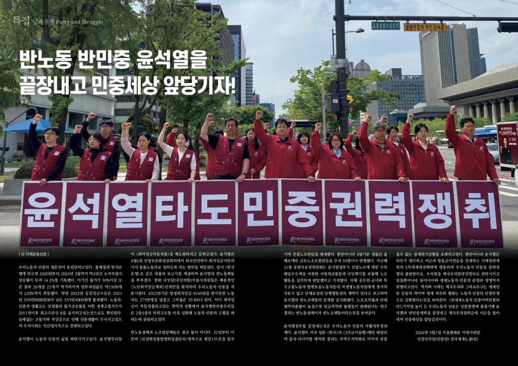 우리노동자·민중의 생존권이 유린당하고있다. 통계청과 한국은행에 따르면 2020년부터 2024년 3월까지 약4년간 소비자물가상승률이 무려 14.3%를 기록했다. 이기간 물가가 50%이상 오른 품목 26개중 25개가 먹거리이며 일부과일값은 약150%에서 220%까지 폭등했다. 반면 2023년 실질임금수준은 2021년 359만9000원보다 낮은 355만4000원에 불과했다. 노동자·민중의 생활고는 실업률과 물가상승률을 더한 경제고통지수가 2011년이후 최고수준인 8을 유지하고있는것으로도 확인된다. 유례없는 고물가와 저임금으로 인해 민중생활이 무너지고있으며 우리사회는 인간생지옥으로 전변되고있다.