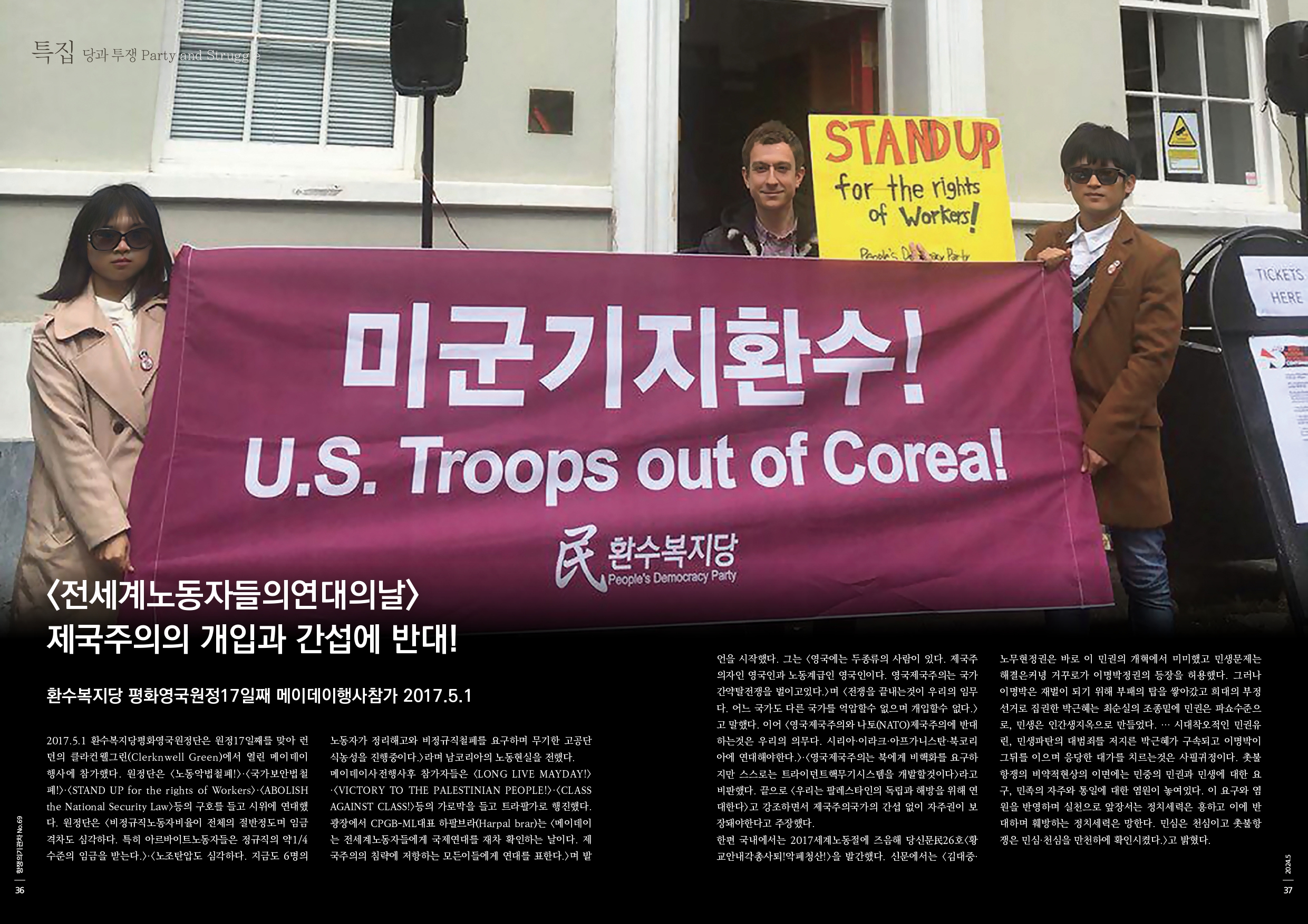 2017.5.1 환수복지당평화영국원정단은 원정17일째를 맞아 런던의 클라컨웰그린(Clerknwell Green)에서 열린 메이데이행사에 참가했다. 원정단은 <노동악법철폐!>·<국가보안법철폐!>·<STAND UP for the rights of Workers>·<ABOLISH the National Security Law>등의 구호를 들고 시위에 연대했다. 원정단은 <비정규직노동자비율이 전체의 절반정도며 임금격차도 심각하다. 특히 아르바이트노동자들은 정규직의 약1/4수준의 임금을 받는다.>·<노조탄압도 심각하다. 지금도 6명의 노동자가 정리해고와 비정규직철폐를 요구하며 무기한 고공단식농성을 진행중이다.>라며 남코리아의 노동현실을 전했다.