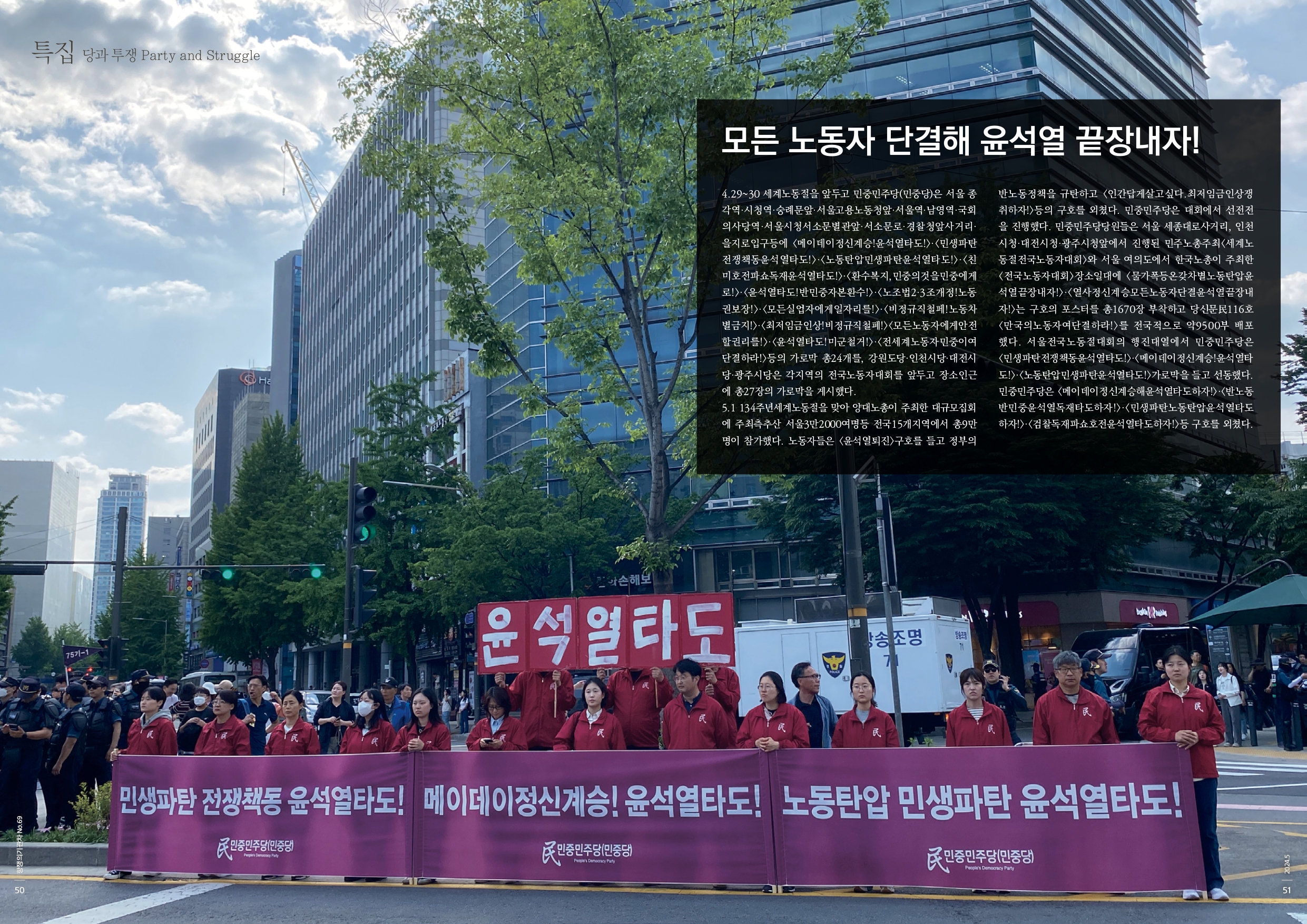 5.1 134주년세계노동절을 맞아 양대노총이 주최한 대규모집회에 주최측추산 서울3만2000여명등 전국15개지역에서 총9만명이 참가했다. 노동자들은 <윤석열퇴진>구호를 들고 정부의 반노동정책을 규탄하고 <인간답게살고싶다.최저임금인상쟁취하자!>등의 구호를 외쳤다. 민중민주당은 대회에서 선전전을 진행했다. 민중민주당당원들은 서울 세종대로사거리, 인천시청·대전시청·광주시청앞에서 진행된 민주노총주최<세계노동절전국노동자대회>와 서울 여의도에서 한국노총이 주최한 <전국노동자대회>장소일대에 <물가폭등온갖차별노동탄압윤석열끝장내자!>·<열사정신계승모든노동자단결윤석열끝장내자!>는 구호의 포스터를 총1670장 부착하고 당신문民116호<만국의노동자여단결하라!>를 전국적으로 약9500부 배포했다. 서울전국노동절대회의 행진대열에서 민중민주당은 <민생파탄전쟁책동윤석열타도!>·<메이데이정신계승!윤석열타도!>·<노동탄압민생파탄윤석열타도!>가로막을 들고 선동했다. 민중민주당은 <메이데이정신계승해윤석열타도하자!>·<반노동반민중윤석열독재타도하자!>·<민생파탄노동탄압윤석열타도하자!>·<검찰독재파쇼호전윤석열타도하자!>등 구호를 외쳤다.