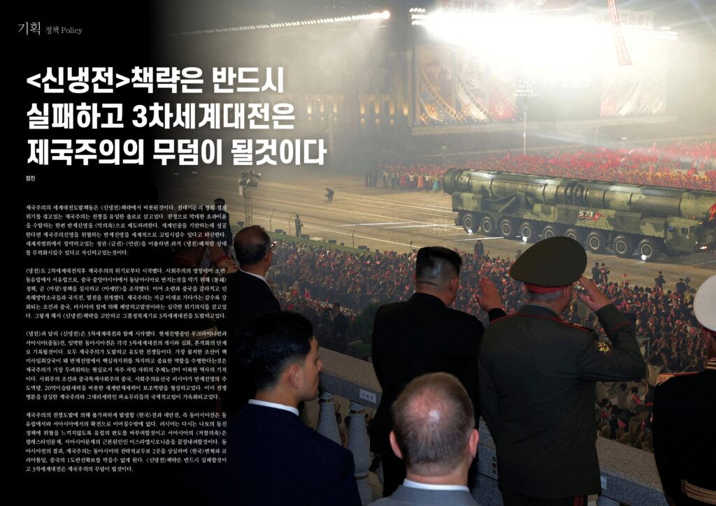 <냉전>과 달리 <신냉전>은 3차세계대전과 함께 시작했다. 현재진행중인 우크라이나전과 서아시아(중동)전, 임박한 동아시아전은 각각 3차세계대전의 개시와 심화, 본격화의 단계로 기록될것이다. 모두 제국주의가 도발하고 유도한 전쟁들이다. 가장 철저한 조선이 핵미사일최강국이 돼 반제진영에서 핵심적지위를 차지하고 중요한 역할을 수행한다는것은 제국주의가 가장 두려워하는 현실로서 자주·자립·자위의 주체노선이 이룩한 역사의 기적이다. 사회주의 조선과 중국특색사회주의 중국, 사회주의유산국 러시아가 반제진영의 주도역량, 20억이슬람세력을 비롯한 세계반제세력이 보조역량을 형성하고있다. 이미 전쟁명분을 상실한 제국주의와 그대리세력인 파쇼무리들의 국제적고립이 가속화되고있다.