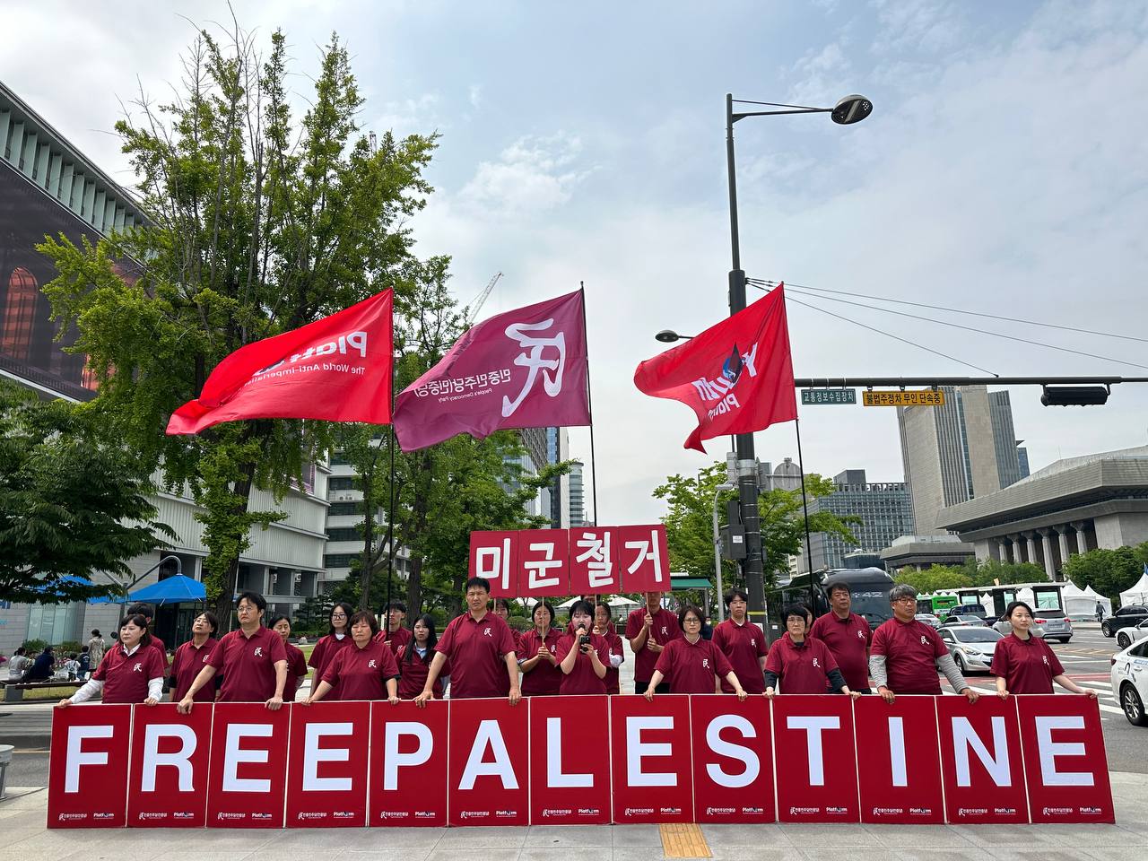 25일 민중민주당(민중당)은 미대사관앞에서 <FREE PALESTINE> 구호를 내세우고 정당연설회를 진행했다.