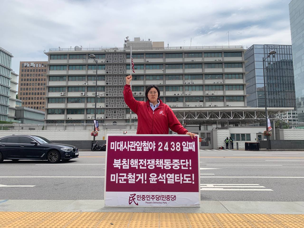30일 민중민주당(민중당)은 미대사관앞에서 <친미호전윤석열타도! 북침핵전쟁책동중단! 핵전쟁화근 미군철거!> 구호를 들고 평화시위를 2871일째 전개했다.
