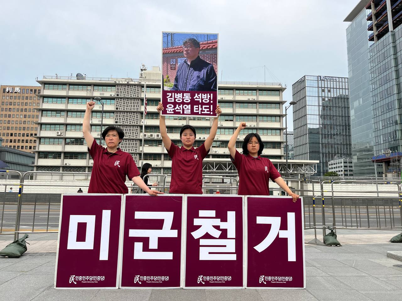 7일 민중민주당(민중당)은 미대사관앞에서 <친미호전윤석열타도! 북침핵전쟁책동중단! 핵전쟁화근 미군철거!> 구호를 들고 평화시위를 2879일째 전개했다.
