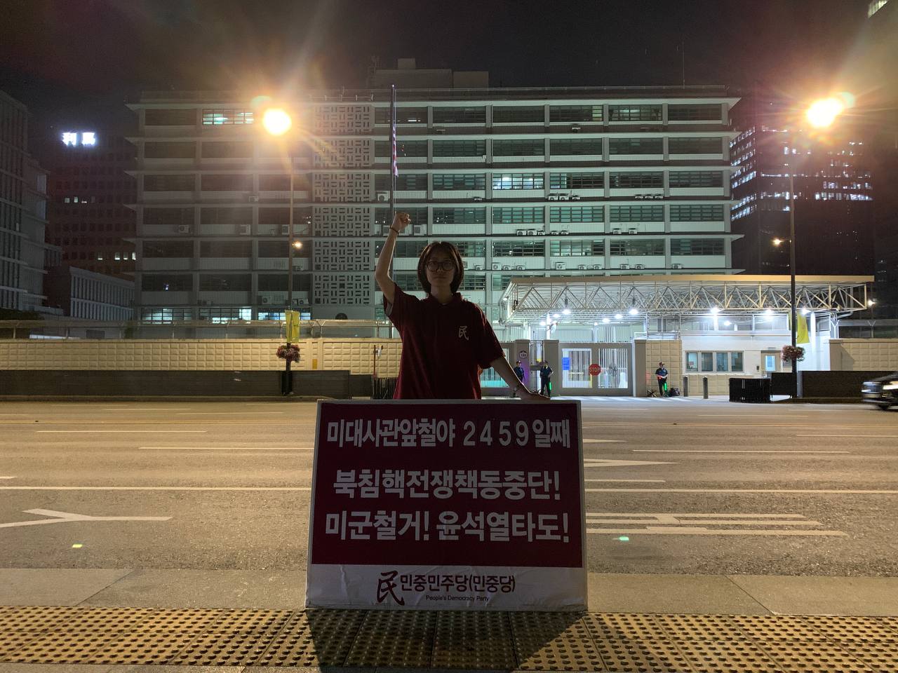 20일 민중민주당(민중당)은 미대사관앞에서 <친미호전윤석열타도! 북침핵전쟁책동중단! 핵전쟁화근 미군철거!> 구호를 들고 평화시위를 2892일째 전개했다.
