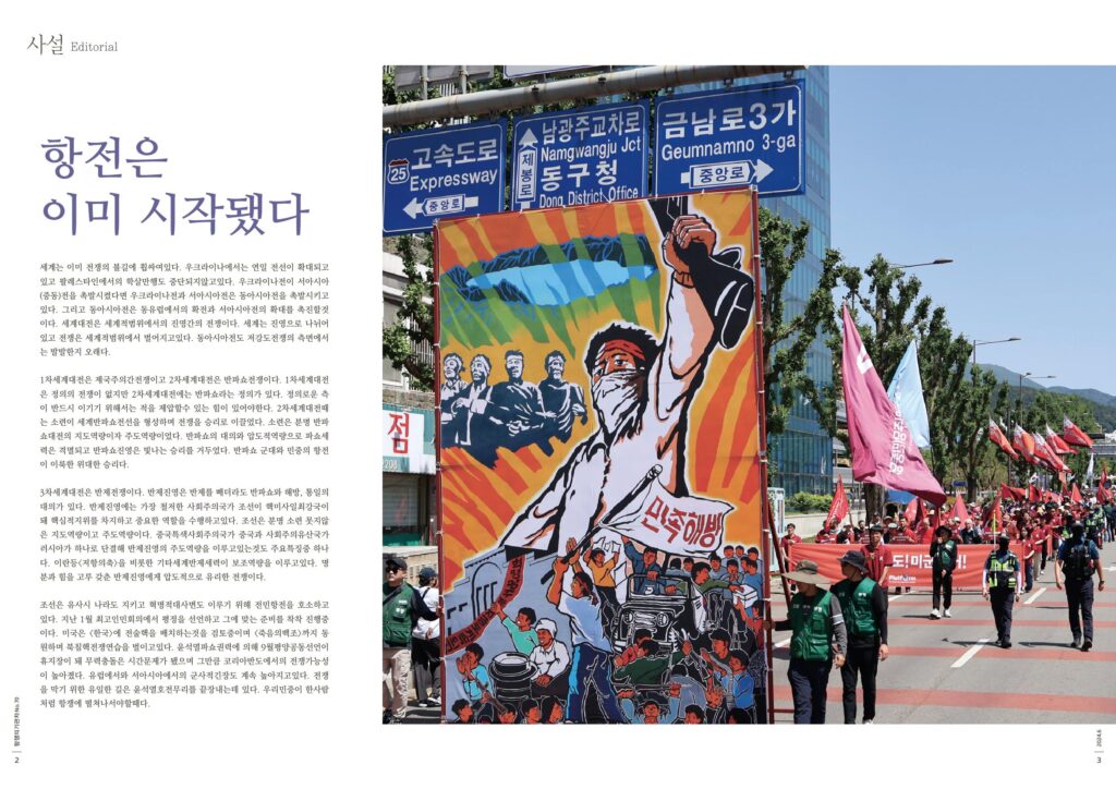 세계는 이미 전쟁의 불길에 휩싸여있다. 우크라이나에서는 연일 전선이 확대되고있고 팔레스타인에서의 학살만행도 중단되지않고있다. 우크라이나전이 서아시아(중동)전을 촉발시켰다면 우크라이나전과 서아시아전은 동아시아전을 촉발시키고있다. 그리고 동아시아전은 동유럽에서의 확전과 서아시아전의 확대를 촉진할것이다. 세계대전은 세계적범위에서의 진영간의 전쟁이다. 세계는 진영으로 나뉘어 있고 전쟁은 세계적범위에서 벌어지고있다. 동아시아전도 저강도전쟁의 측면에서는 발발한지 오래다.