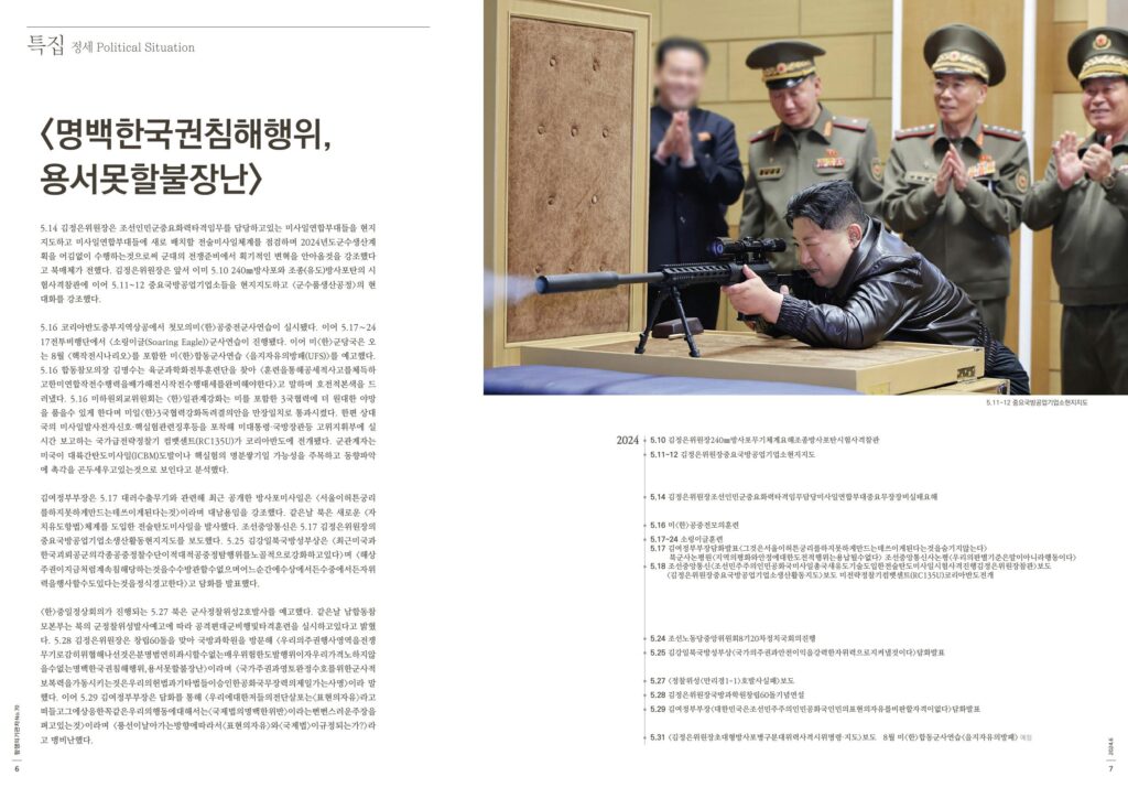 김여정부부장은 5.17 대러수출무기와 관련해 최근 공개한 방사포미사일은 <서울이허튼궁리를하지못하게만드는데쓰이게된다는것>이라며 대남용임을 강조했다. 같은날 북은 새로운 <자치유도항법>체계를 도입한 전술탄도미사일을 발사했다. 조선중앙통신은 5.17 김정은위원장의 중요국방공업기업소생산활동현지지도를 보도했다. 5.25 김강일북국방성부상은 <최근미국과한국괴뢰공군의각종공중정찰수단이적대적공중정탐행위를노골적으로강화하고있다>며 <해상주권이지금처럼계속침해당하는것을수수방관할수없으며어느순간에수상에서든수중에서든자위력을행사할수도있다는것을정식경고한다>고 담화를 발표했다.