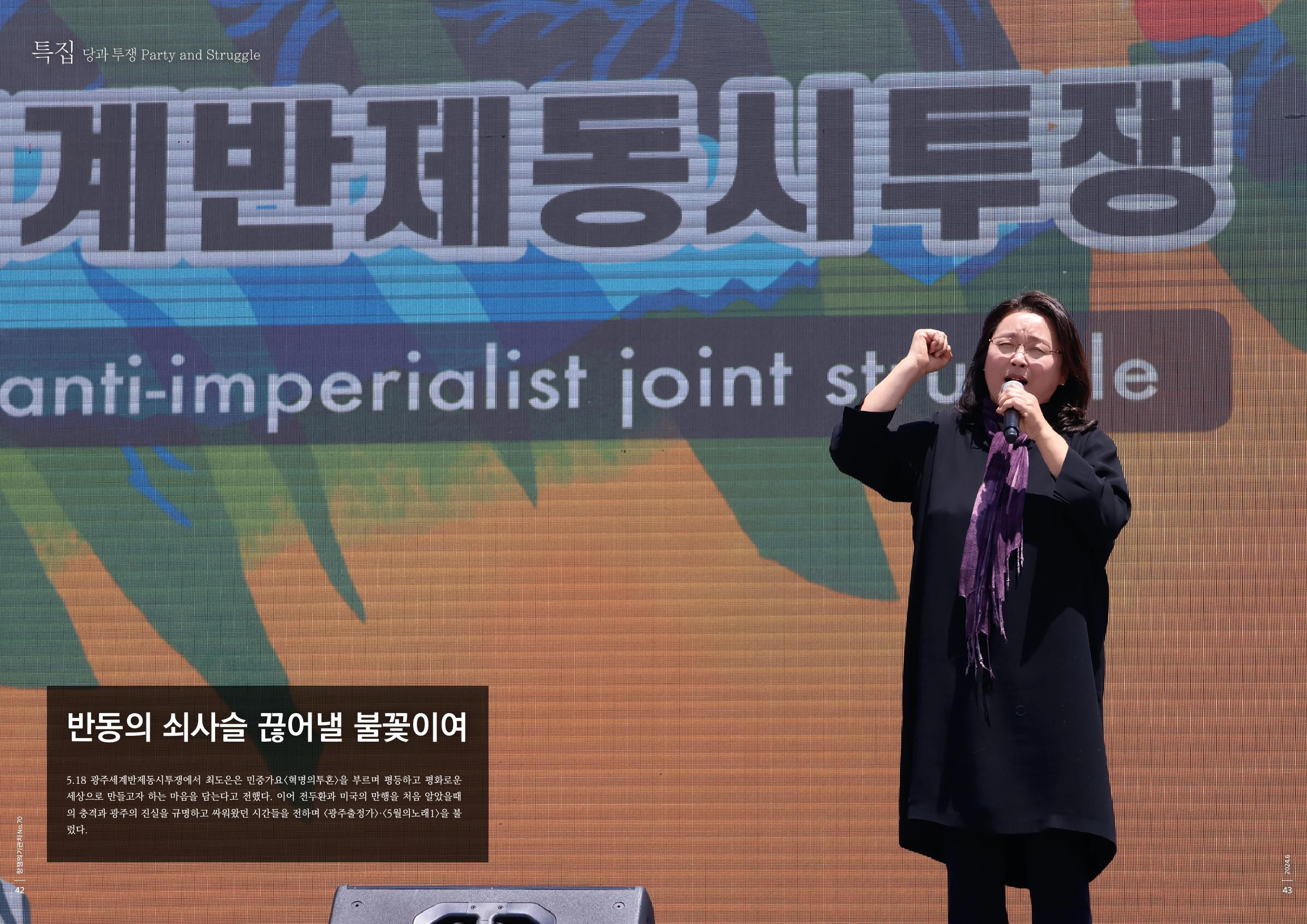 항쟁의기관차 〈2024.6 항쟁의기관차〉 반동의 쇠사슬 끊어낼 불꽃이여 2024년 6월 22일 FacebookTwitter 5.18 광주세계반제동시투쟁에서 최도은은 민중가요<혁명의투혼>을 부르며 평등하고 평화로운 세상으로 만들고자 하는 마음을 담는다고 전했다. 이어 전두환과 미국의 만행을 처음 알았을때의 충격과 광주의 진실을 규명하고 싸워왔던 시간들을 전하며 <광주출정가>·<5월의노래1>을 불렀다.