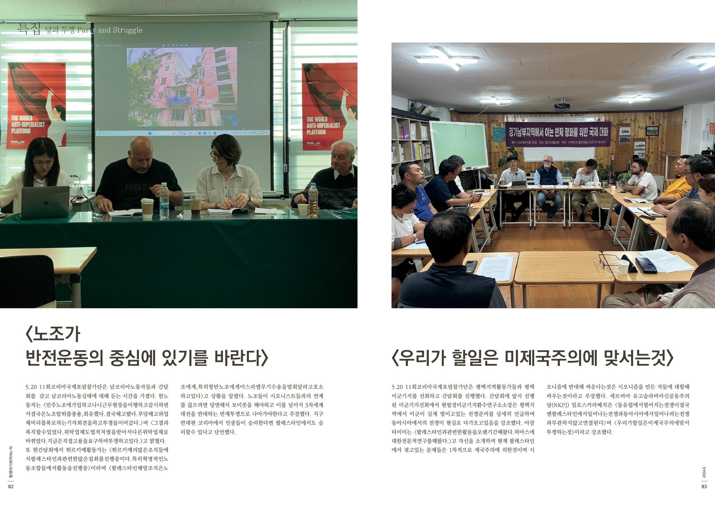 또 한간담회에서 튀르키예활동가는 <튀르키예의많은조직들에서팔레스타인과관련한많은집회를진행중이다.특히혁명적인노동조합들에서활동을진행중>이라며 <팔레스타인해방조직은노조에게,특히항만노조에게이스라엘무기수송을멈춰달라고호소하고있다>고 상황을 알렸다. 노조들이 시오니스트들과의 연계를 끊으려면 당면해서 보이콧을 해야하고 이를 넘어서 3차세계대전을 반대하는 반제투쟁으로 나아가야한다고 주장했다. 지구반대편 코리아에서 민중들이 승리한다면 팔레스타인에서도 승리할수 있다고 단언했다.